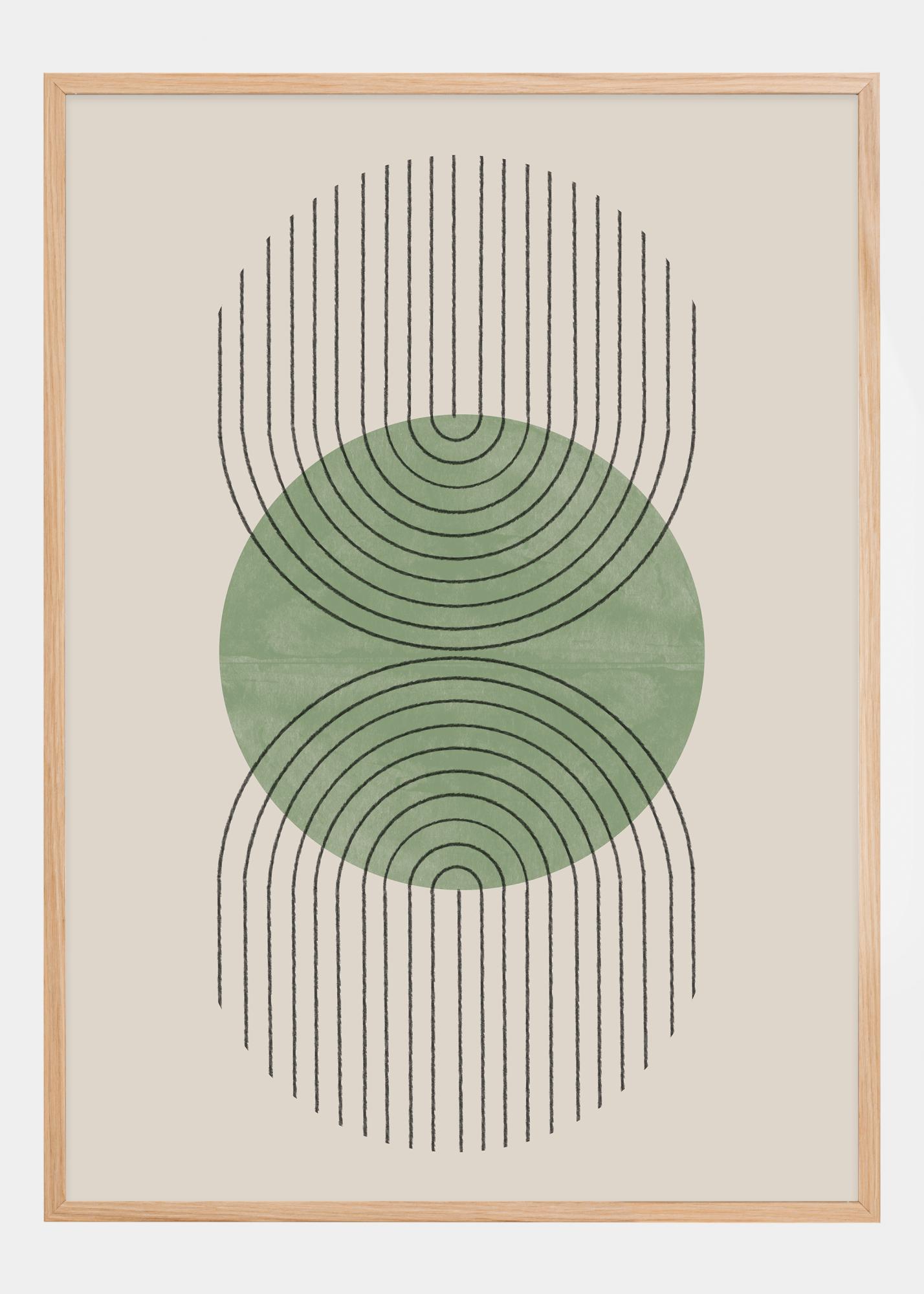 Този плакат е минималистично произведение на изкуството, което изтъква наситена зелена кръгова форма, обградена от серия черни линии, което създава усещане за пространство и дълбочина. Зеленият нюанс в кръга варира по интензивност, което създава визуален ефект на измерение и текстура. Линиите, които се простират навън от ръба на кръга, създават почти хипнотичен ефект и представят геометрична хармония.