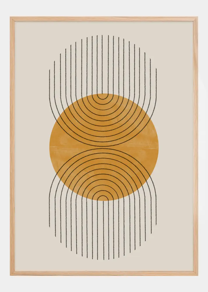 Този изкусно изработен плакат представя силна визуална композиция, поставяйки наситена, златисто жълта кръгла форма в центъра, заобиколена от вертикални черни линии, които създават оптична илюзия за разширяване и свиване. Концентричните кръгове в рамките на жълтата форма добавят усещане за дълбочина и придават органично качество на иначе строго геометричния модел.
