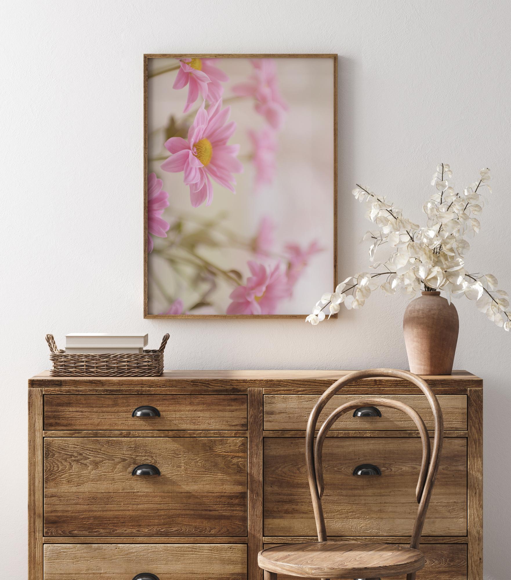 Плакат за близък план с красиви розови маргаритки. На бежов фон красотата на цветята създава радостна и спокойна атмосфера. Със светложълт тичинка, това е перфектният отпечатък за създаване на спокойна и любяща атмосфера.