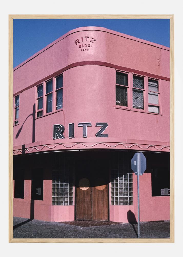 Цветен постер с розовата двуетажна сграда Ritz. Тъмносиньото небе подчертава тъмнорозовата сграда и тъмнокафявата входна врата. Слънчевата светлина отразява сянката на улична лампа и уличен знак върху фасадата на сградата. Перфектен принт за всички, които обичат 1940-те години.