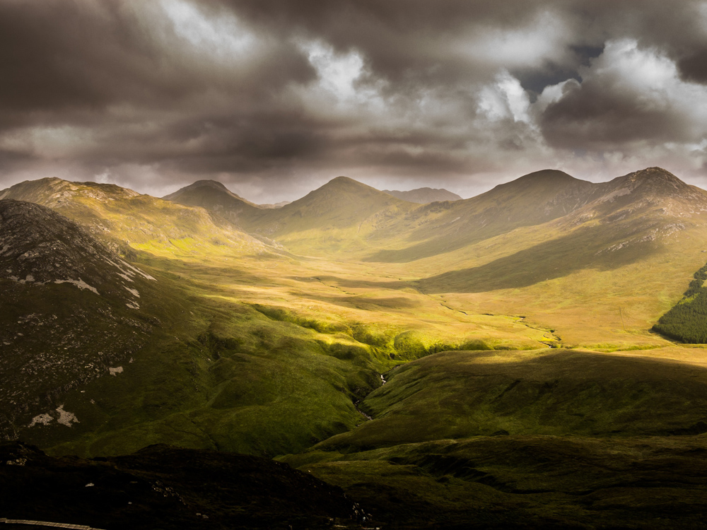 Драматичен пейзажен портрет с буреносни облаци, които се издигат над планинска верига, докато слънцето осветява долината отдолу. Приглушените тонове подчертават драматизма на изображението и правят фотографията наистина забележителна. Най-добре подхожда на рамка, която подчертава дълбочината на изображението и не отвлича вниманието от мотива.