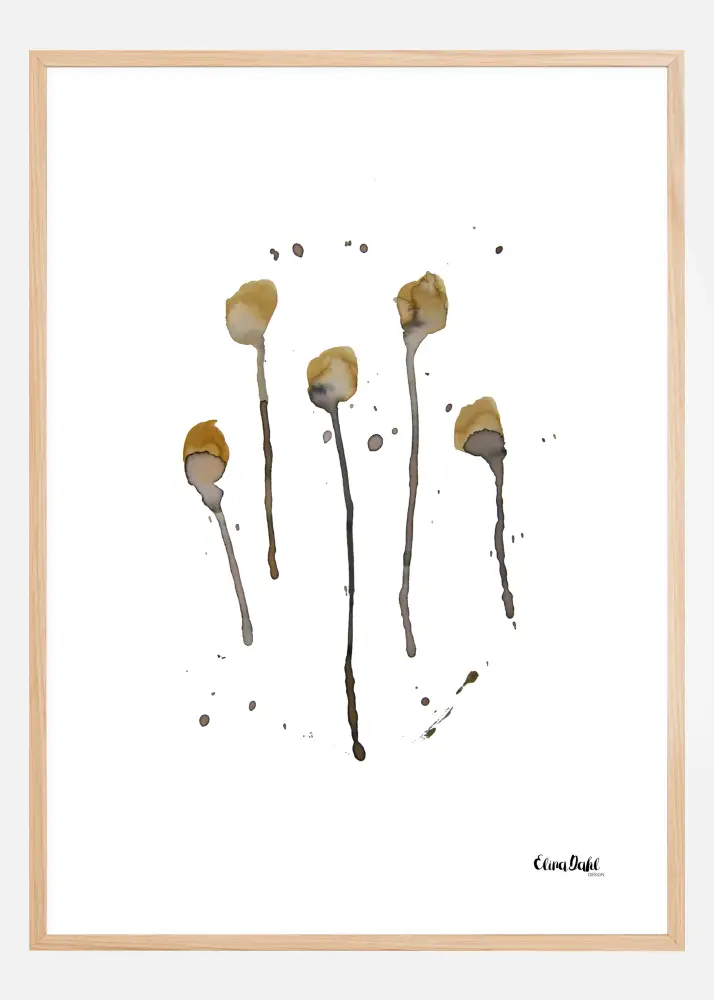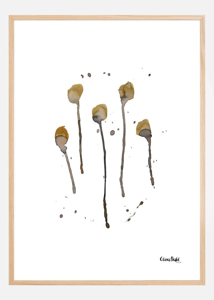 Ботанически печат с пет малки цветни стъбла. Разположени на бял фон, петте кафяви и сиви цветни стъбла стоят изправени в средата на постера. Кафяви пръски обграждат стъблата произволно. Един прекрасен постер за всички, които обичат растенията.