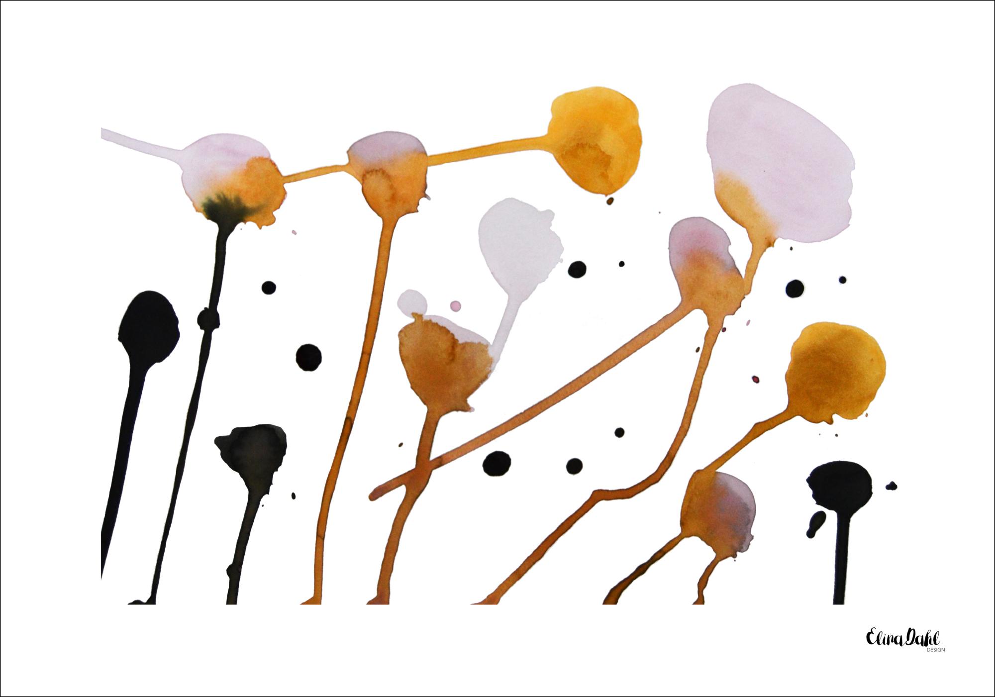Ботанически постер с оранжеви, розови и черни цветни стъбла. Нарисувани върху бяла повърхност, различно оцветените цветни стъбла са разположени случайно и черни точки са разпръснати между стъблата. За стилно усещане можете да добавите това на неутрална стена.