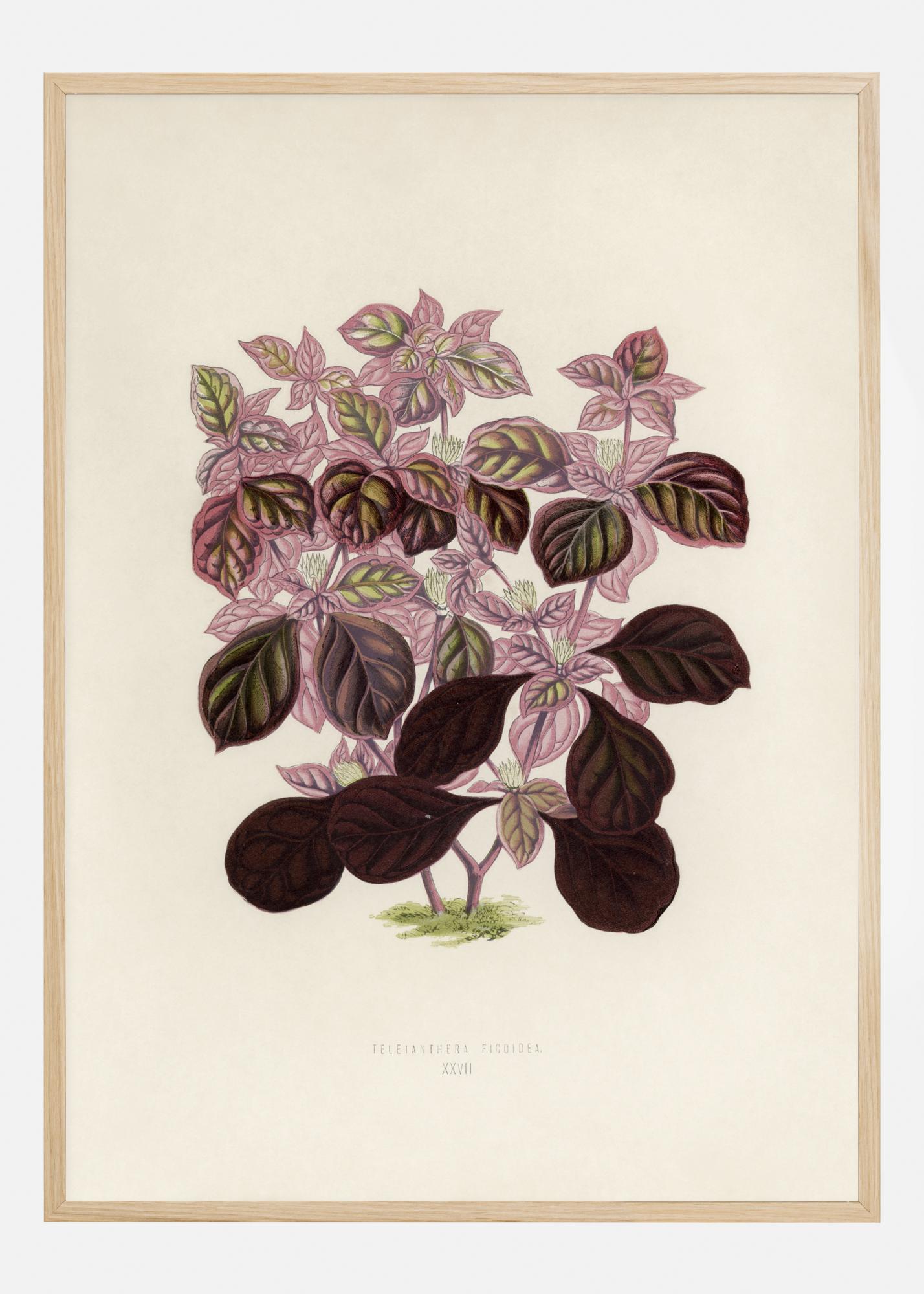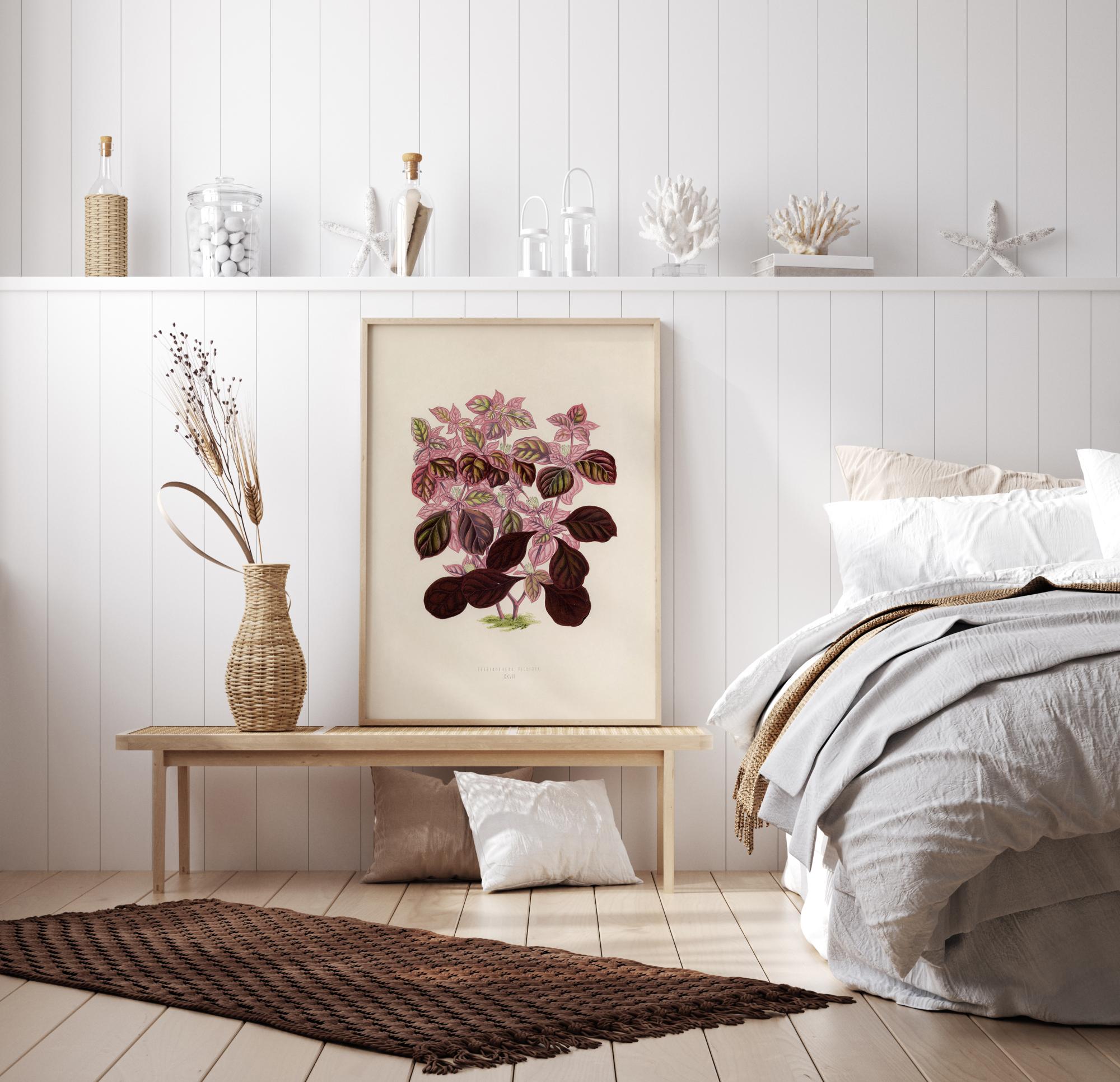 Една красива ръчно отпечатана картина на две розови Plectranthus scutellarioides. Меката бежова фон подчертава красивите нюанси на розово и зелено. Надолу към стъблото на растението виненочервеният цвят създава топло усещане в плаката. Закачете този отпечатък във вашата колекция от изкуство у дома.