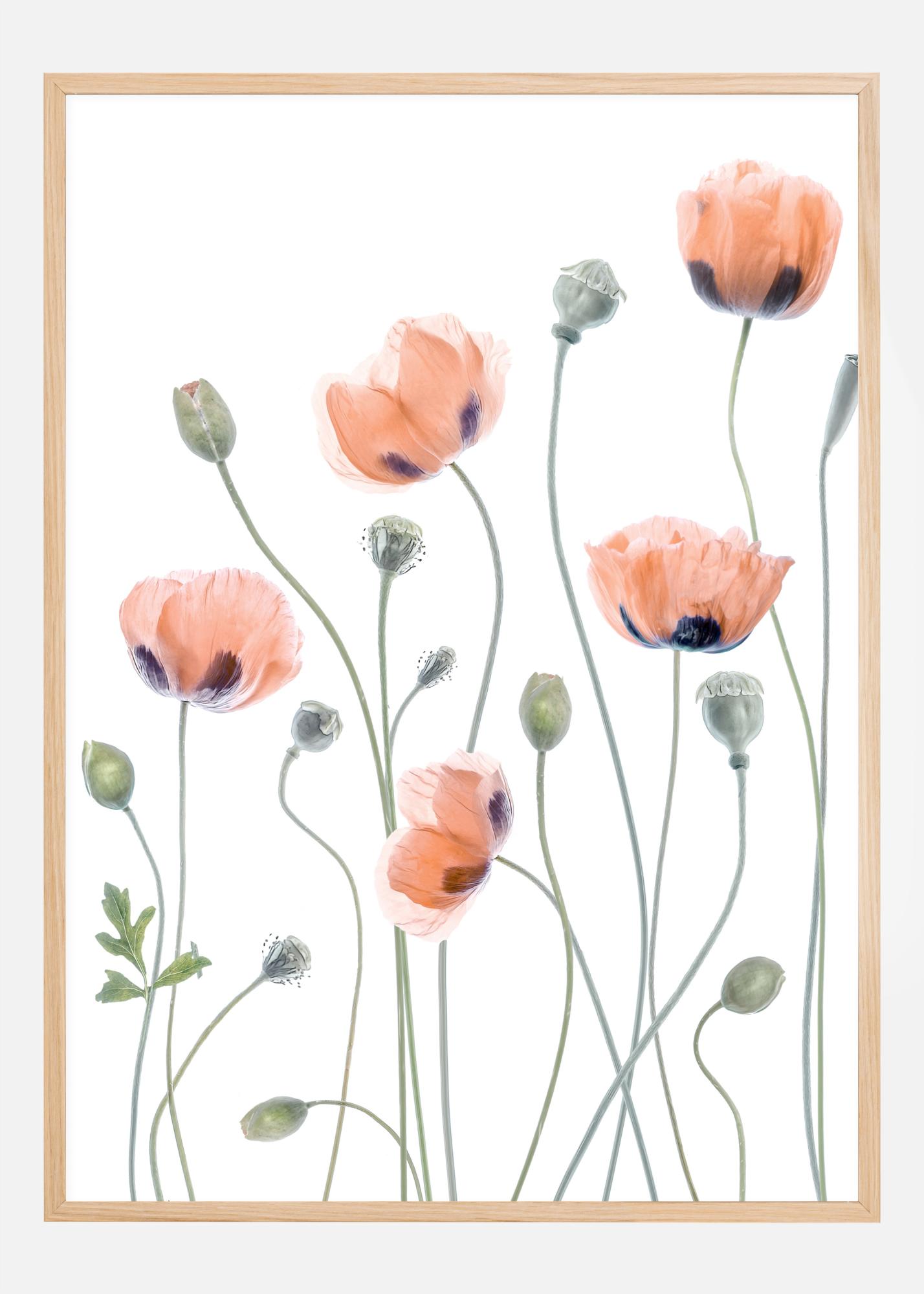 Очарователен принт с макове, които се преплитат със суха трева. На бял фон прасковените макове се сливат перфектно със светлозелената трева. Всеки мак е на различна височина. Красив и успокояващ постер, подходящ да се окачи в селска кухня.