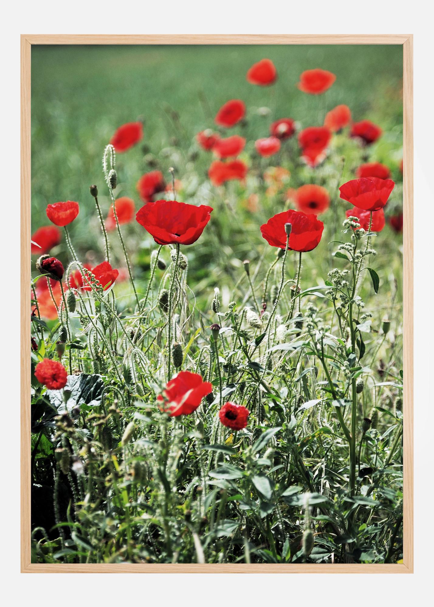 Един красив макроснимка на поле с макове. Тъмнозелената трева подчертава яркостта на маковите цветове и създава свежо усещане. Маковете стоят изправени на полето, докато тревата расте наоколо. Един релаксиращ и прекрасен постер, който да закачите в спалнята си.