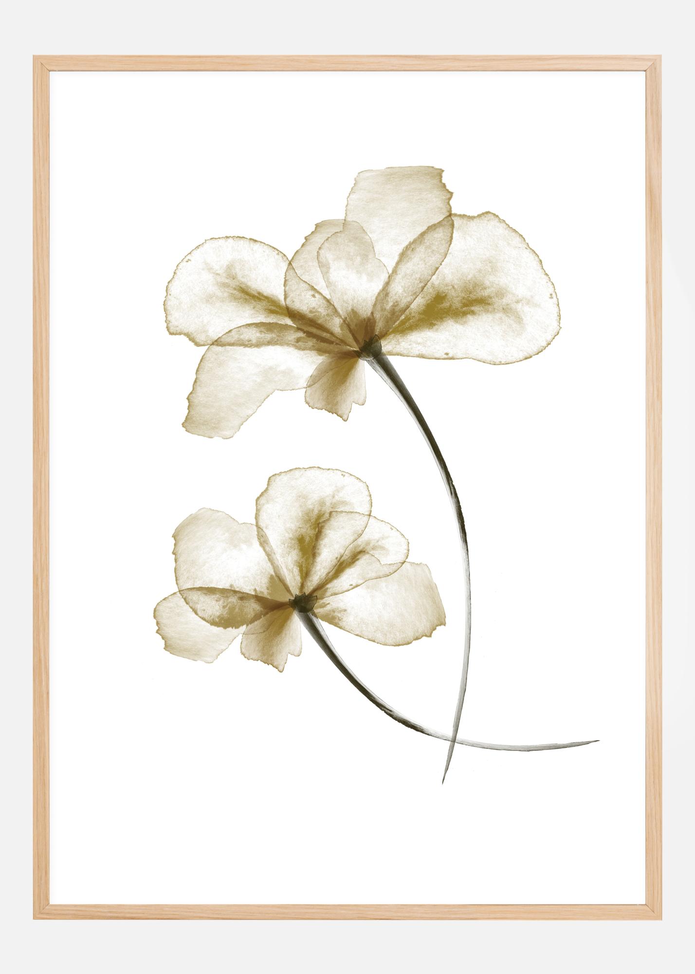 Един прост, но елегантен постер с две бели цветя на бял фон. В долната част на принта цветята се припокриват красиво, придавайки на принта фин щрих. Прозрачността в меките кафяви и бежови тонове би изглеждала перфектно на кремава стена.