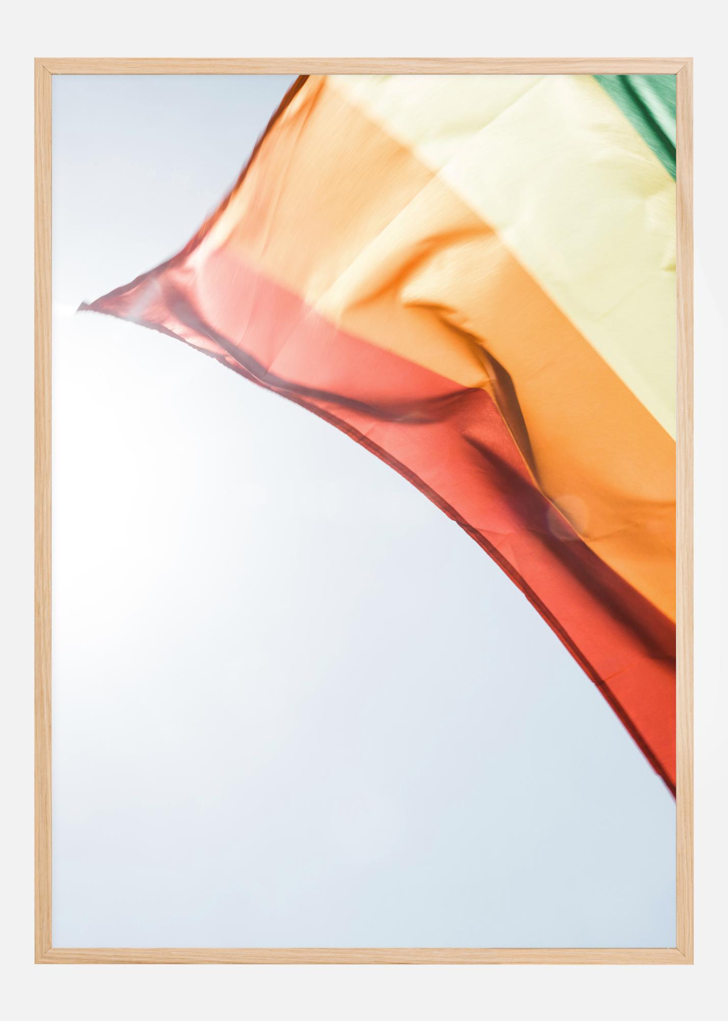Символичен принт на знаме върху сив фон. Разположено в горната половина на принта, знамето леко се развява на вятъра. Червените, оранжевите, жълтите и зелените ивици са подредени хоризонтално на знамето. Цветен постер, който ще озари всяка празна стена.