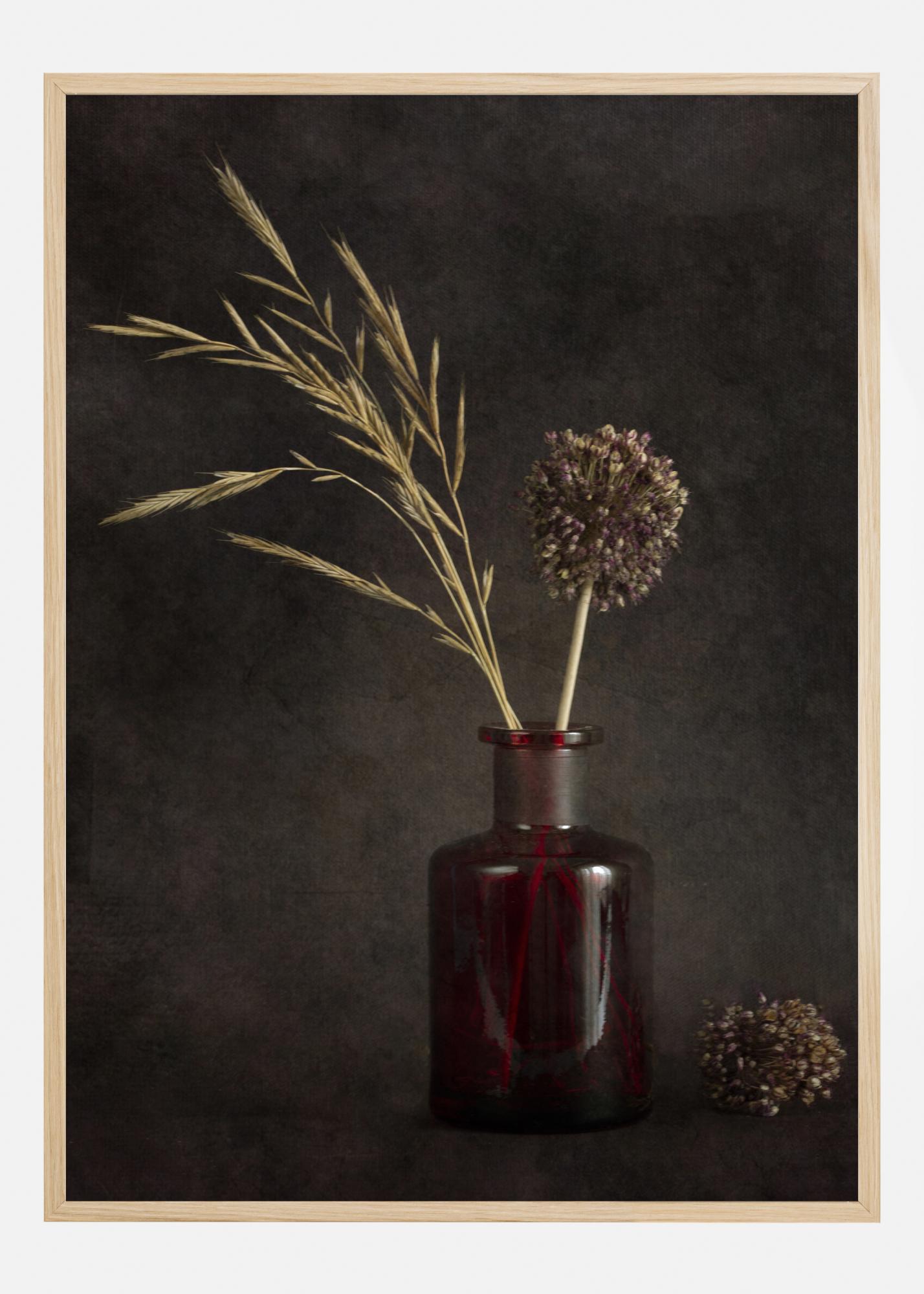 Един красив, но прост принт на две изсушени треви в стъклен буркан. На тъмнокафяв фон жълтите треви са поставени в червен буркан. Вдясно от вазата лежи още една изсушена трева. Един красив плакат, който добавя малко цвят на бяла стена.