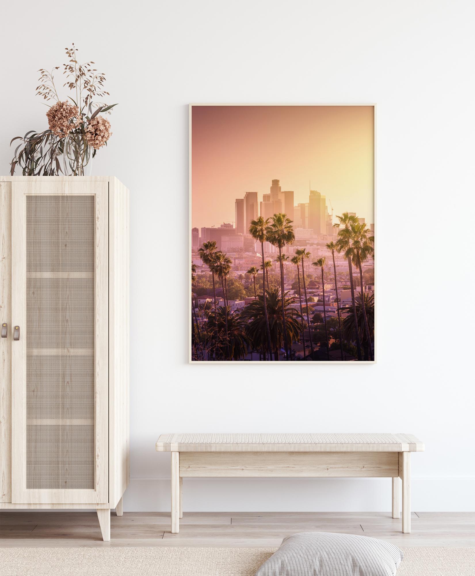 Отпечатък на град, заснет от разстояние. На преден план доминират високите палми, докато небостъргачите в далечината гледат към града. Оранжевото и лилавото небе се отразява върху сградите на града и им придава лилав вид. Перфектен постер за всеки, който обича архитектурата.