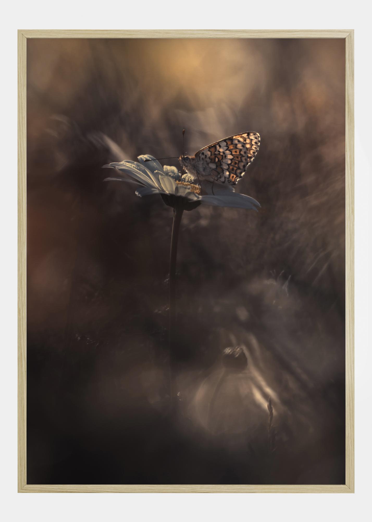 Перфектен макроизглед на оранжева пеперуда, която седи върху единично стъбло на маргаритка. На фон с меки пастелни цветове, размазаните цветове подчертават красивото и деликатно цвете и пеперуда. Дъхоспиращ красив плакат, който да окачите над камина.