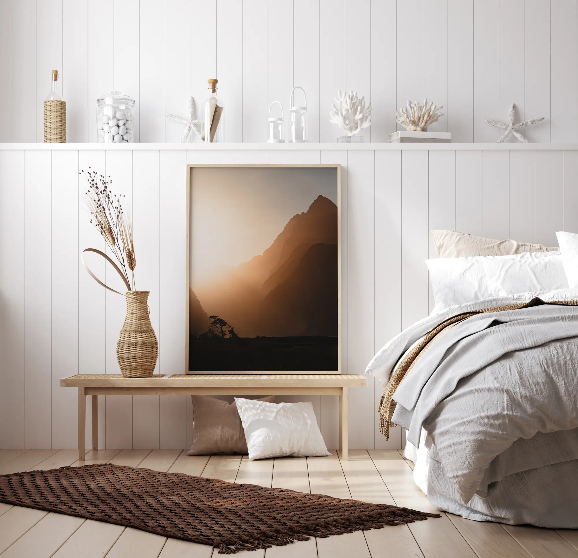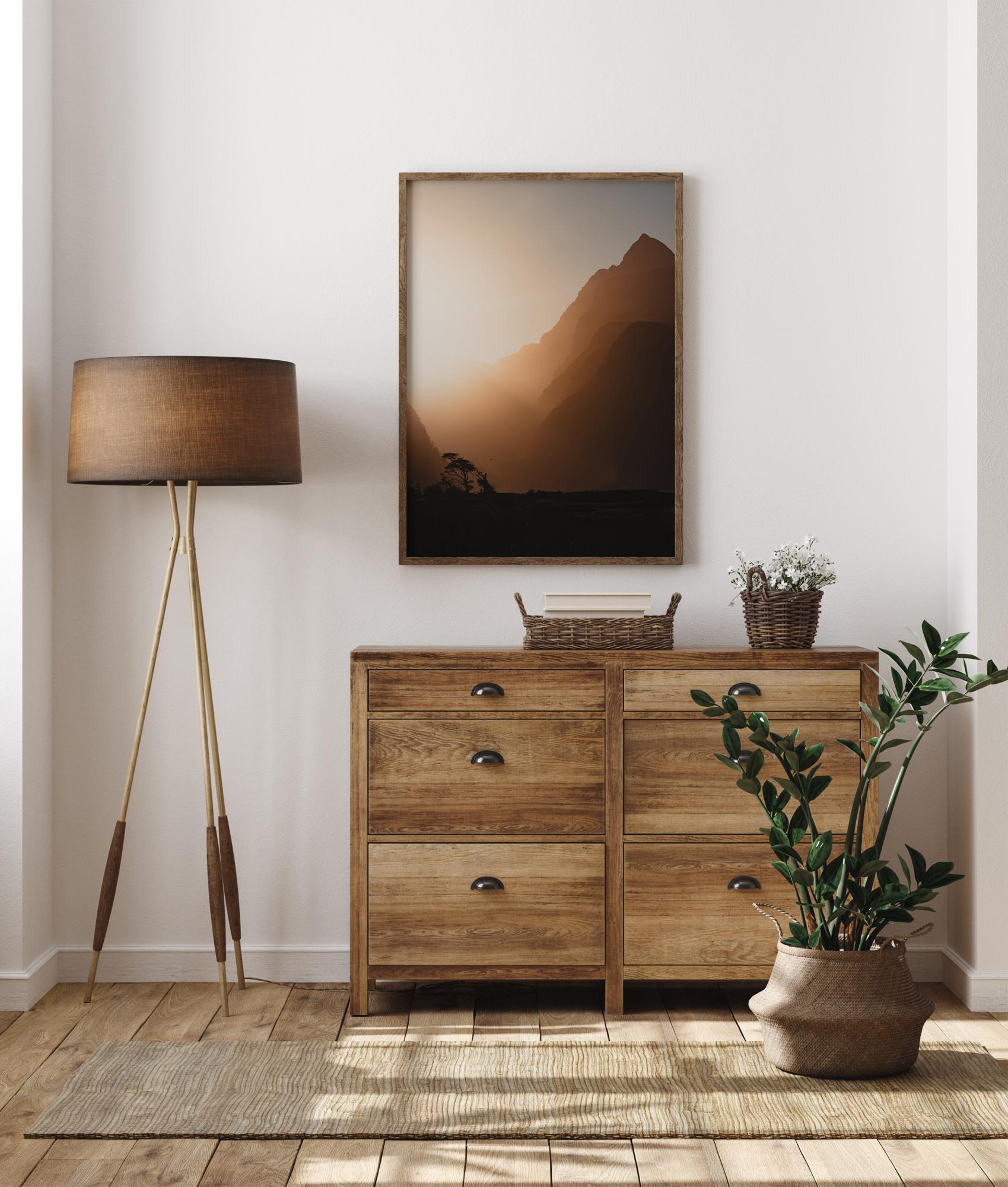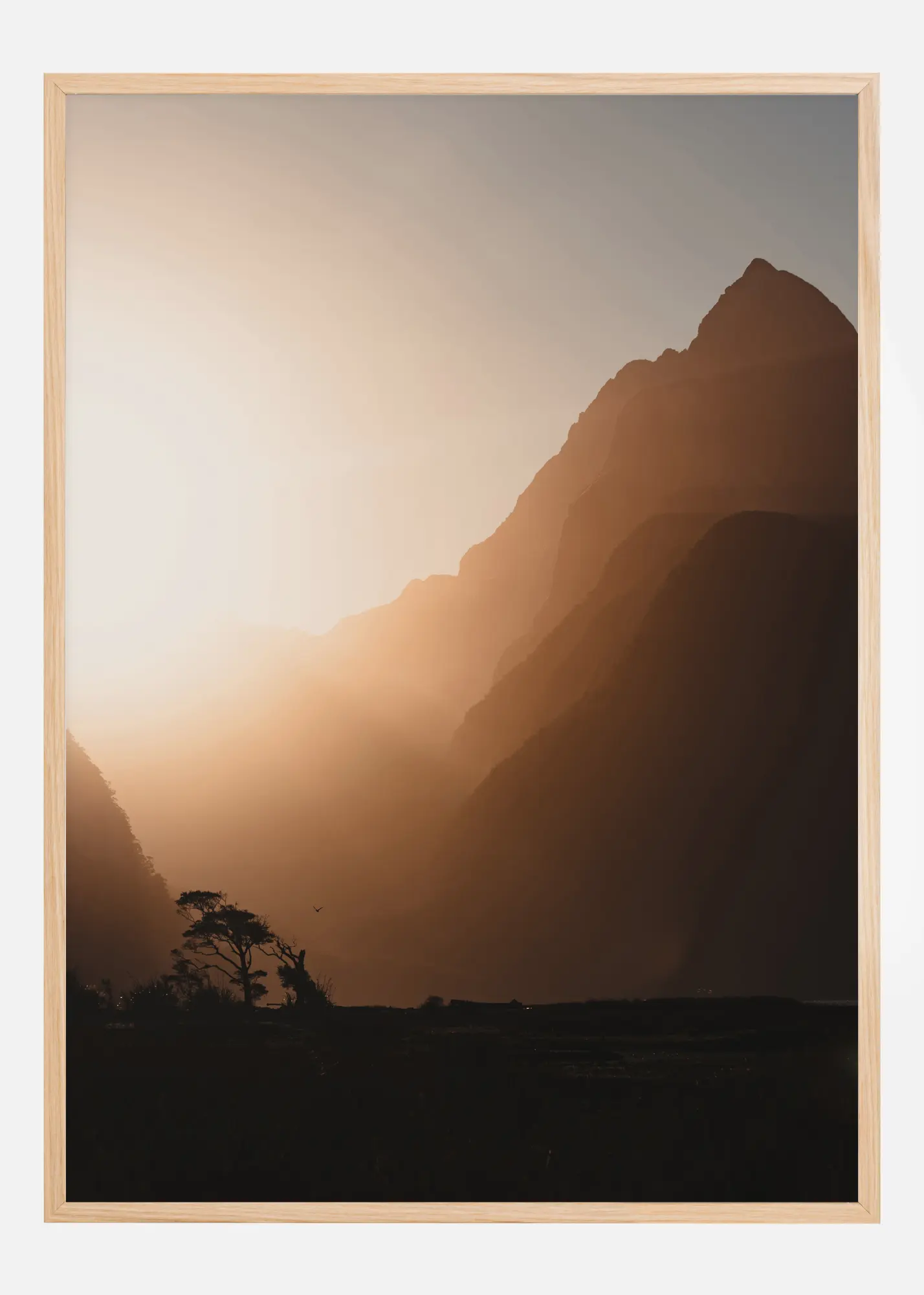 Един красив, живописен плакат с пейзаж при залез слънце. Пропастта между хълмовете свети с ярки заслепяващи лъчи и създава тъмен преден план. Отдалечените дървета и птицата показват съществуването на живота. Украсете спалнята си с тази живописна картина.