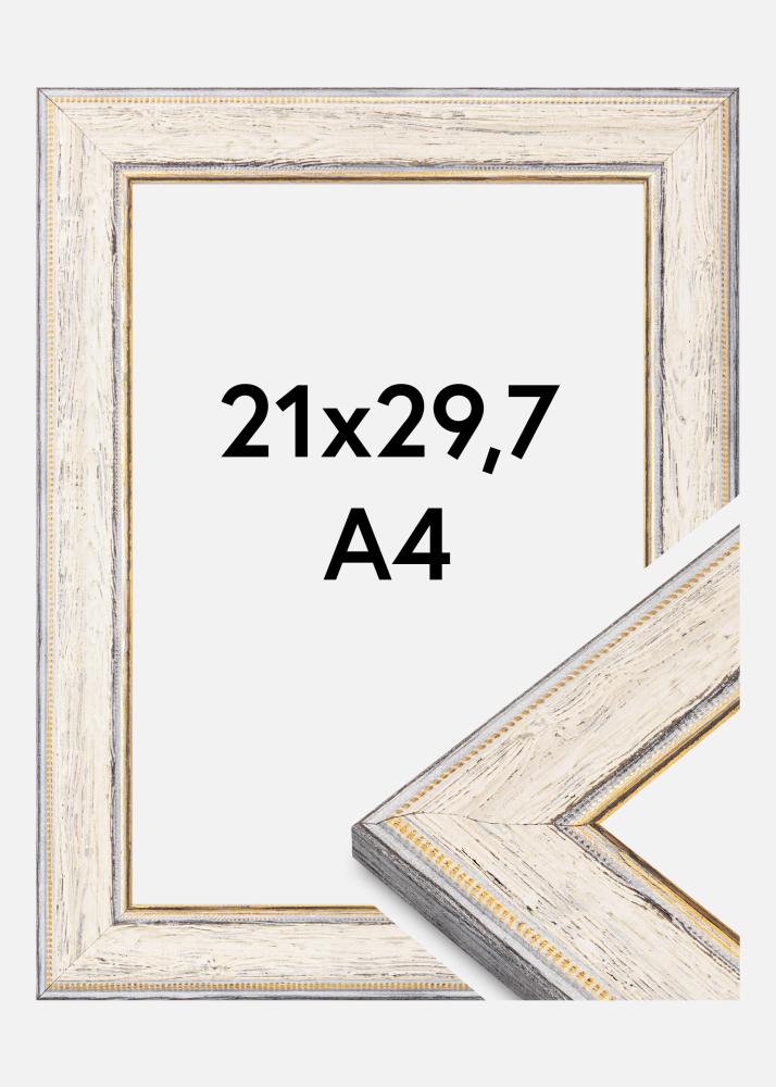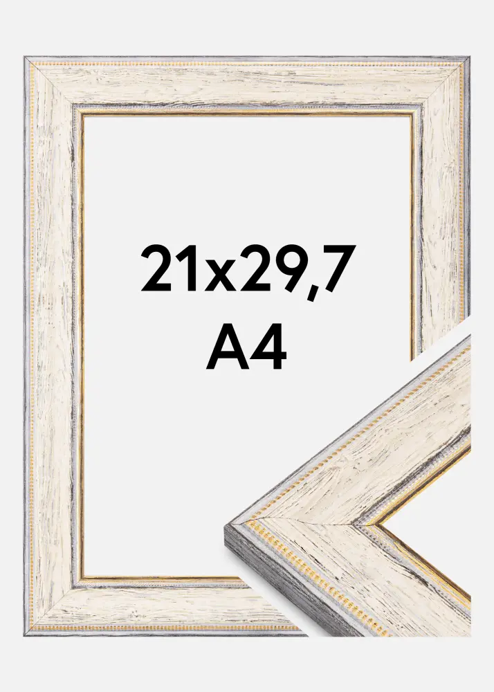 Тази красива фоторамка с размери 21x29,7 см (A4) е перфектна комбинация от дизайн, вдъхновен от винтидж стил, и модерна функционалност. Със своята рустикална бяла и сива дървесна текстура, допълнена с деликатни златни детайли по вътрешния ръб, тази рамка предлага чаровен състарен вид. Профилираният дизайн и ясната дървесна текстура я правят отличен избор за селски, shabby chic или класически интериорни стилове.