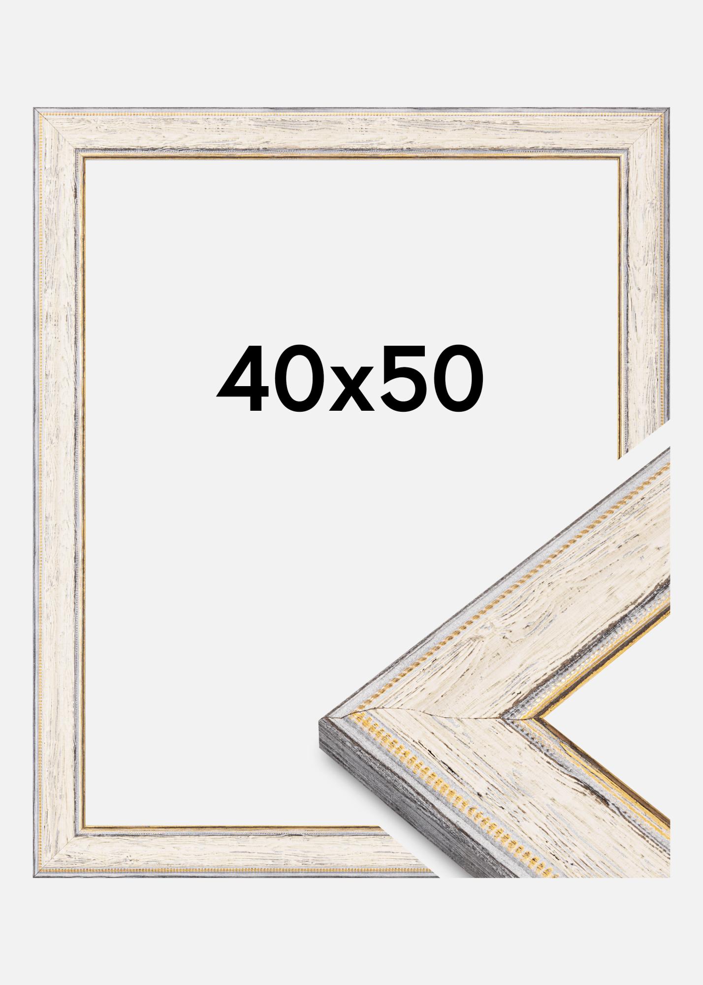 Тази елегантна фоторамка е перфектна комбинация от винтидж вдъхновение и модерна функционалност. С размери 40x50 см, тя е идеална за подчертаване на вашите любими фотографии или произведения на изкуството. Рамката е изработена от дърво и има красива, рустикална бяла и сива повърхност, която й придава очарователно старинен вид. Деликатните златни детайли по вътрешния ръб добавят класическо докосване, което се вписва перфектно както в селски, така и в shabby chic интериори.