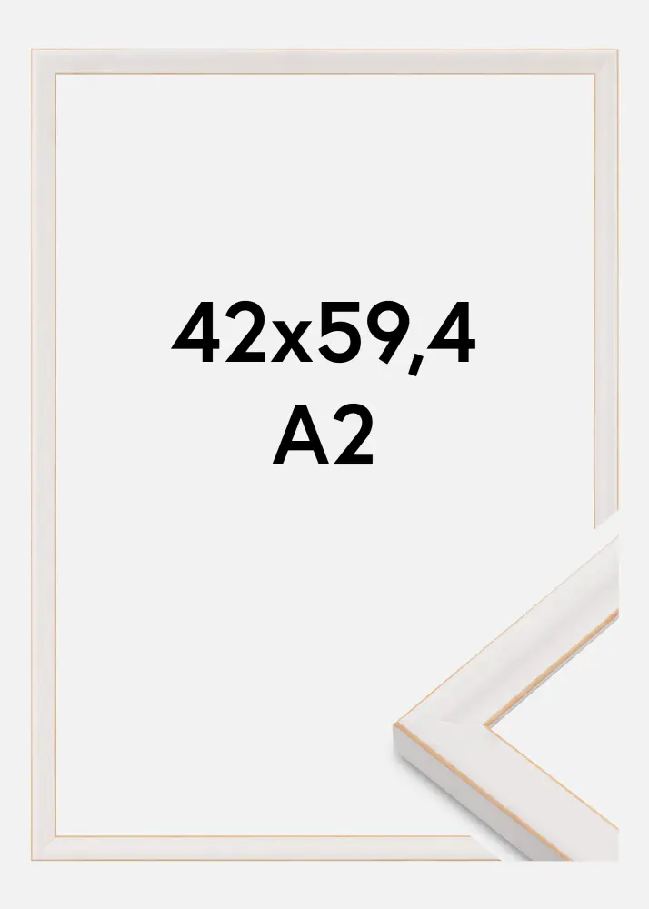 Тази елегантна фоторамка в мек, кремаво бял нюанс с тънък златен кант е идеална комбинация от класически и модерен дизайн. С размер на рамката 42x59,4 см (A2), тя е идеална за подчертаване на произведения на изкуството, фотографии или спомени по един вечен начин. Фината златна детайлност по вътрешния кант придава изискано усещане, което обгръща вашите снимки по елегантен начин.