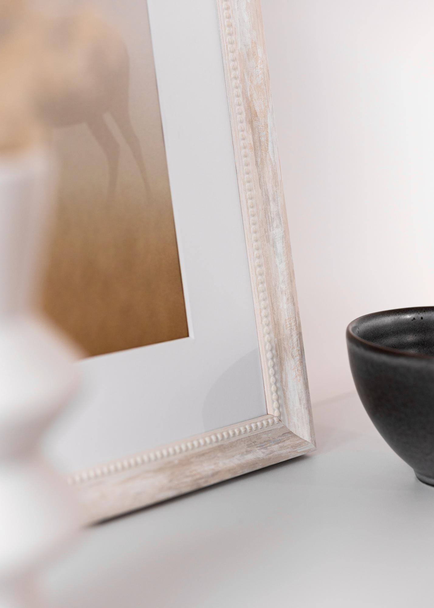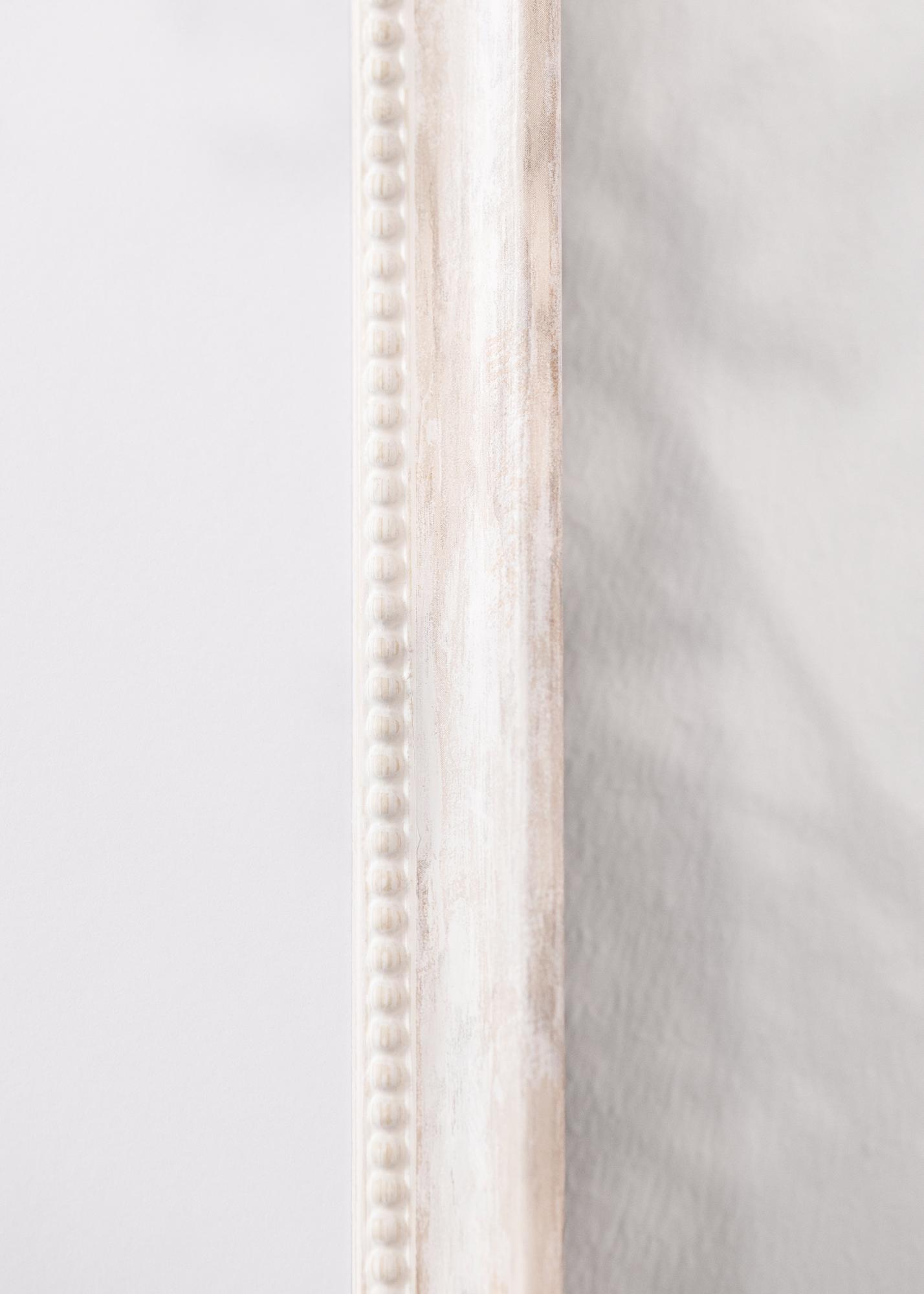 Тази красива фоторамка с размери 70x100 см е перфектна комбинация от рустикален чар и стилна елегантност. Изработена от дърво, тя предлага издръжлива и здрава конструкция, която е допълнена с бяло покритие. Субтилното антично усещане се усилва от декоративния ръб с перли по вътрешната страна, което придава на рамката класически и детайлен дизайн.