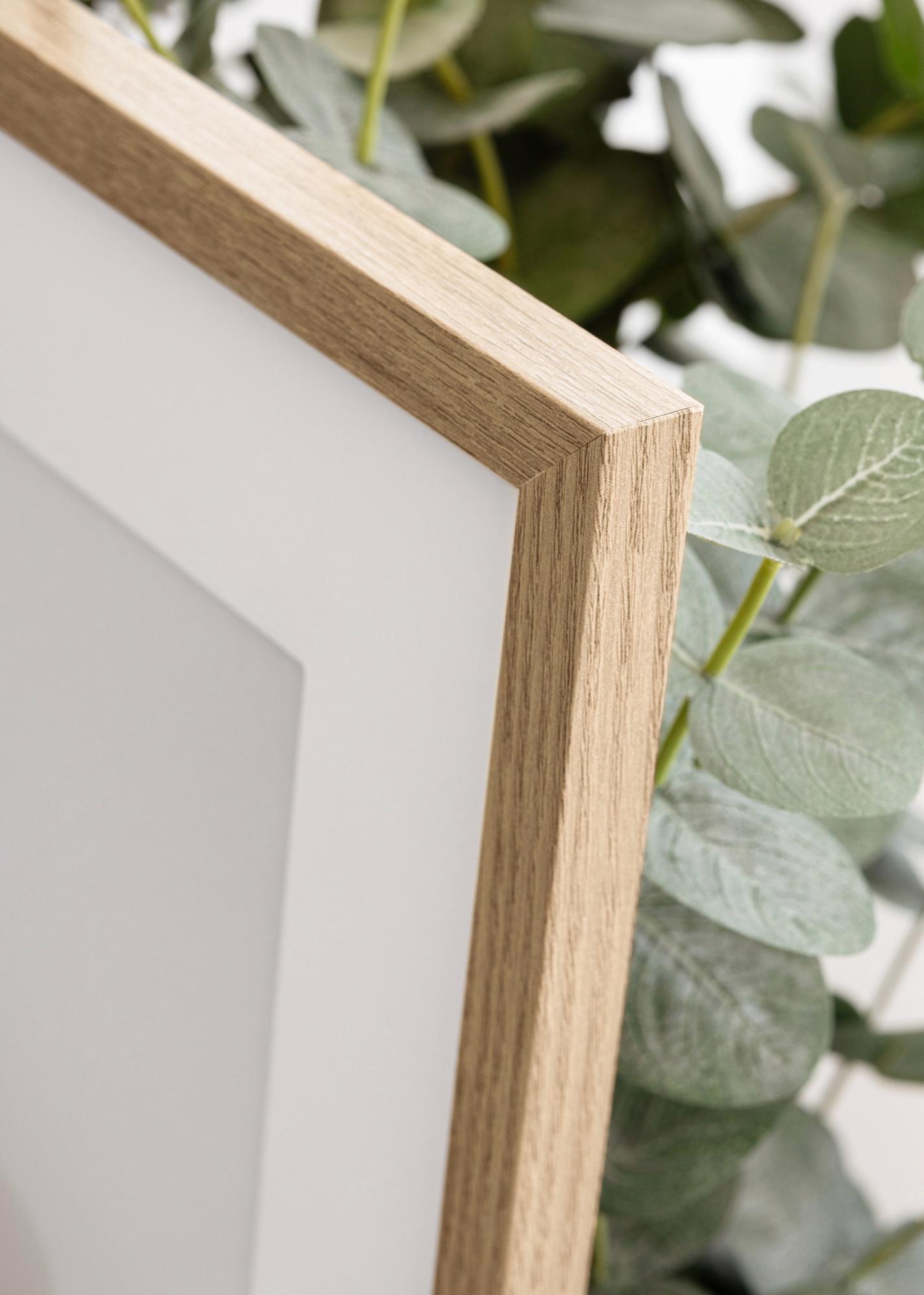 Рамката е изработена от MDF материал с фолиран повърхност в дъбов нюанс и има тънък профил на рамката от 14 мм. Има достатъчно място да допълните снимките си с луксозен паспарту, благодарение на вътрешната дълбочина на рамката (фалшдълбочина) от 12 мм.