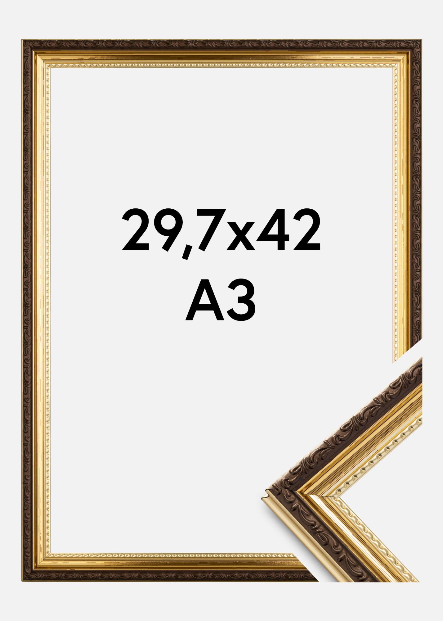 Търсите ли красива украсена рамка в стар стил? Абиско акрилно стъкло злато е здрава златиста рамка с невероятно стилни орнаменти. Листът на рамката, с ширина 25 мм, има блестящ златист цвят с украсена кафява лента в средата. Златистата част също е украсена, с вълнообразен модел най-близо до стъклото.