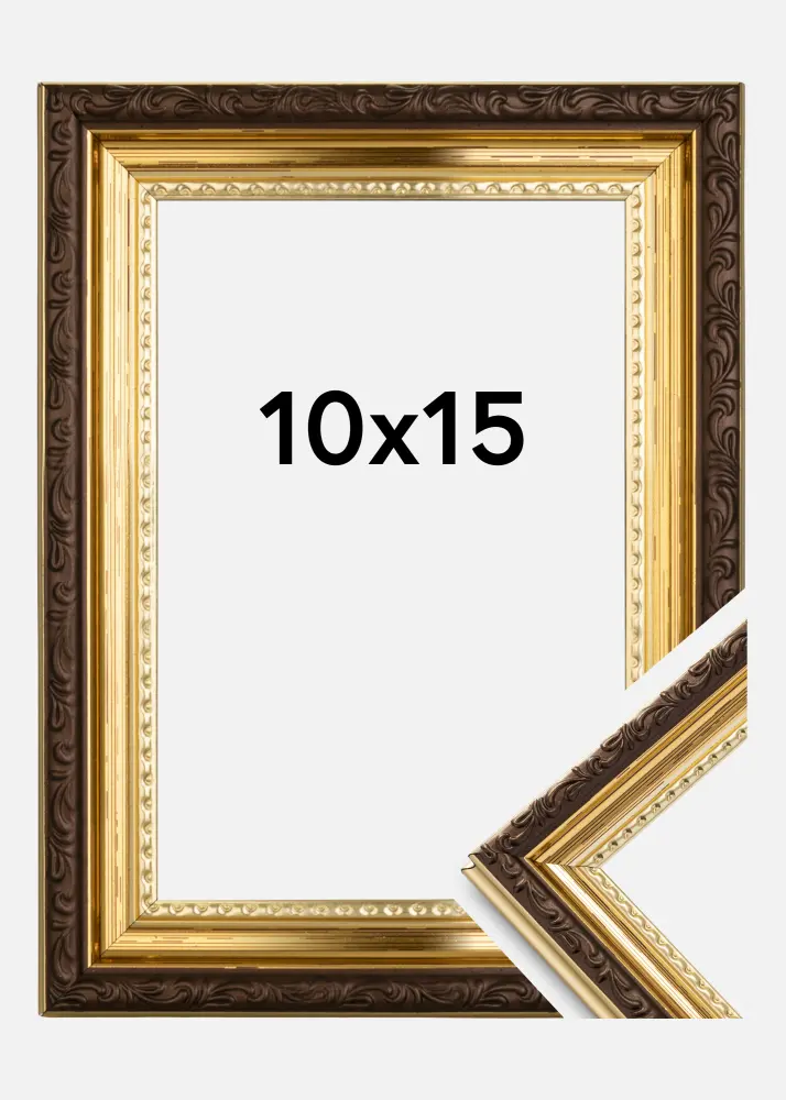 Стартирайте избора на рамка »Abisko е елегантна златиста рамка за снимки в ретро стил с красиви орнаменти.
