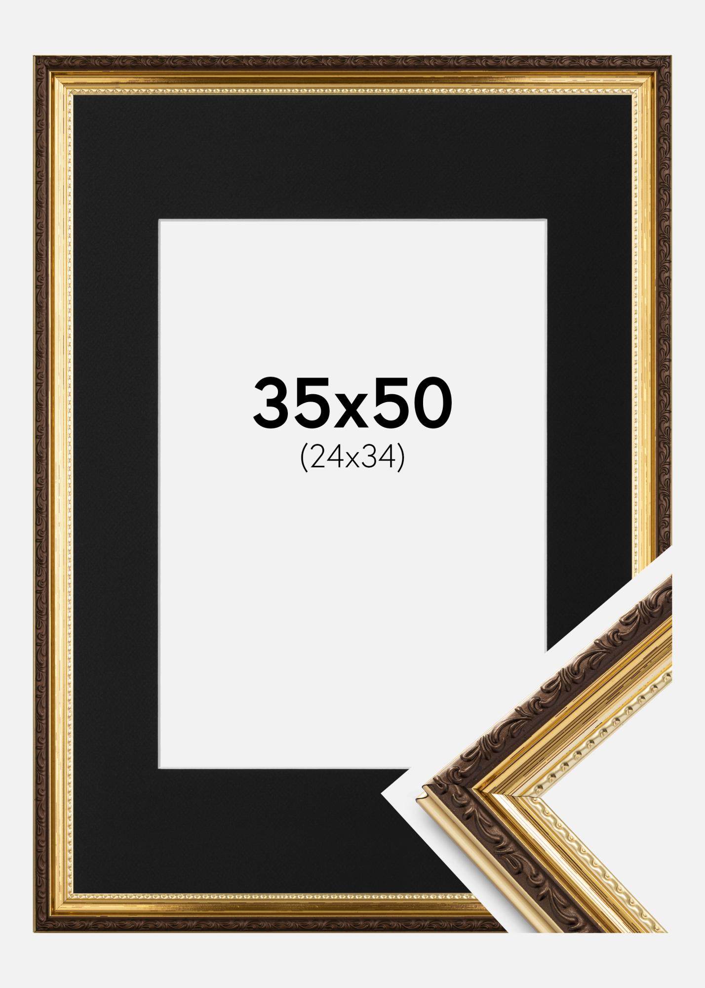 Със ширина от 25 мм и дълбочина от 20 мм рамката придава стабилно усещане, без да доминира. Черното паспарту и бляскавата златна рамка се допълват взаимно и създават вечна рамка, която пасва на всяка стая и всеки дом.