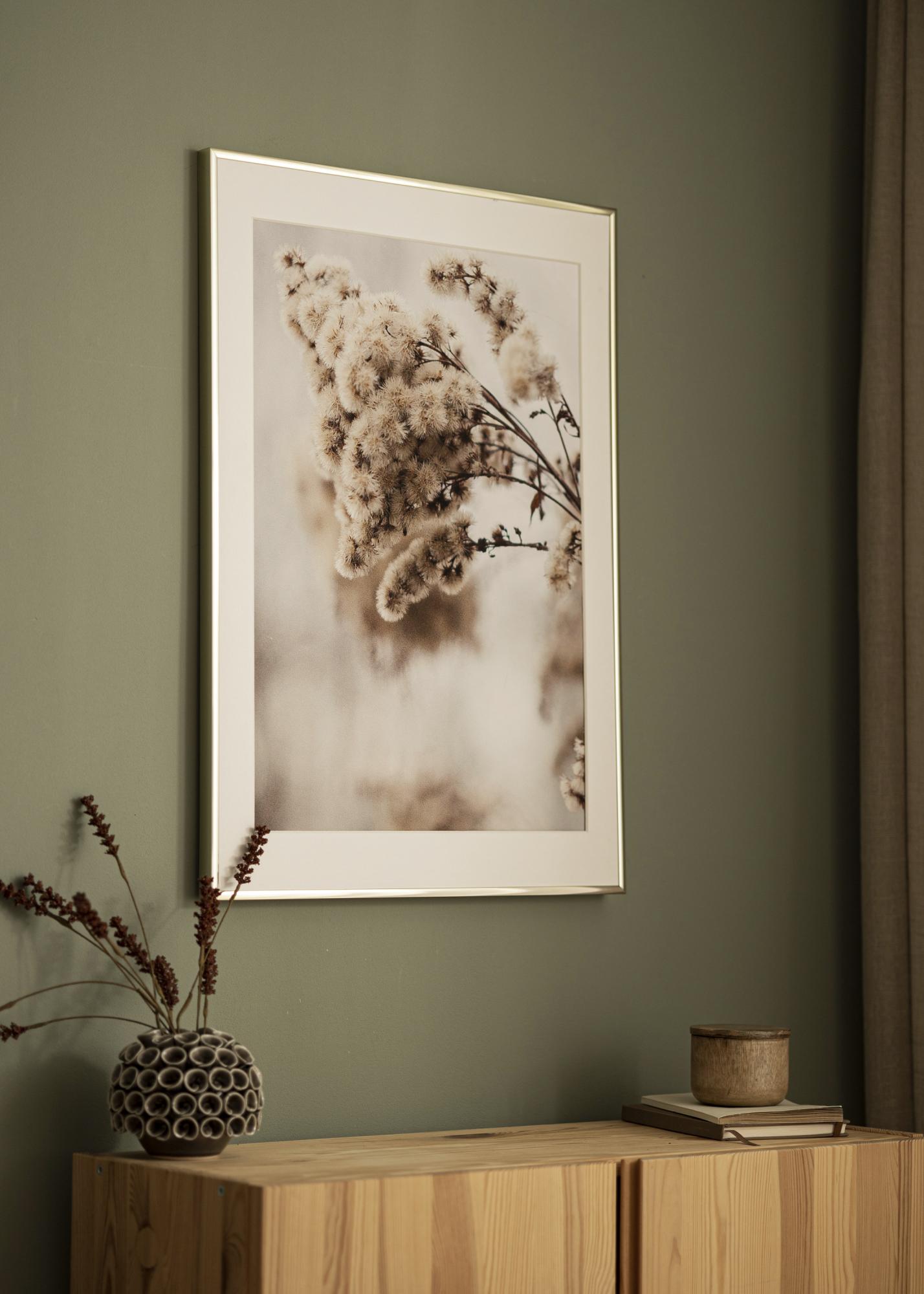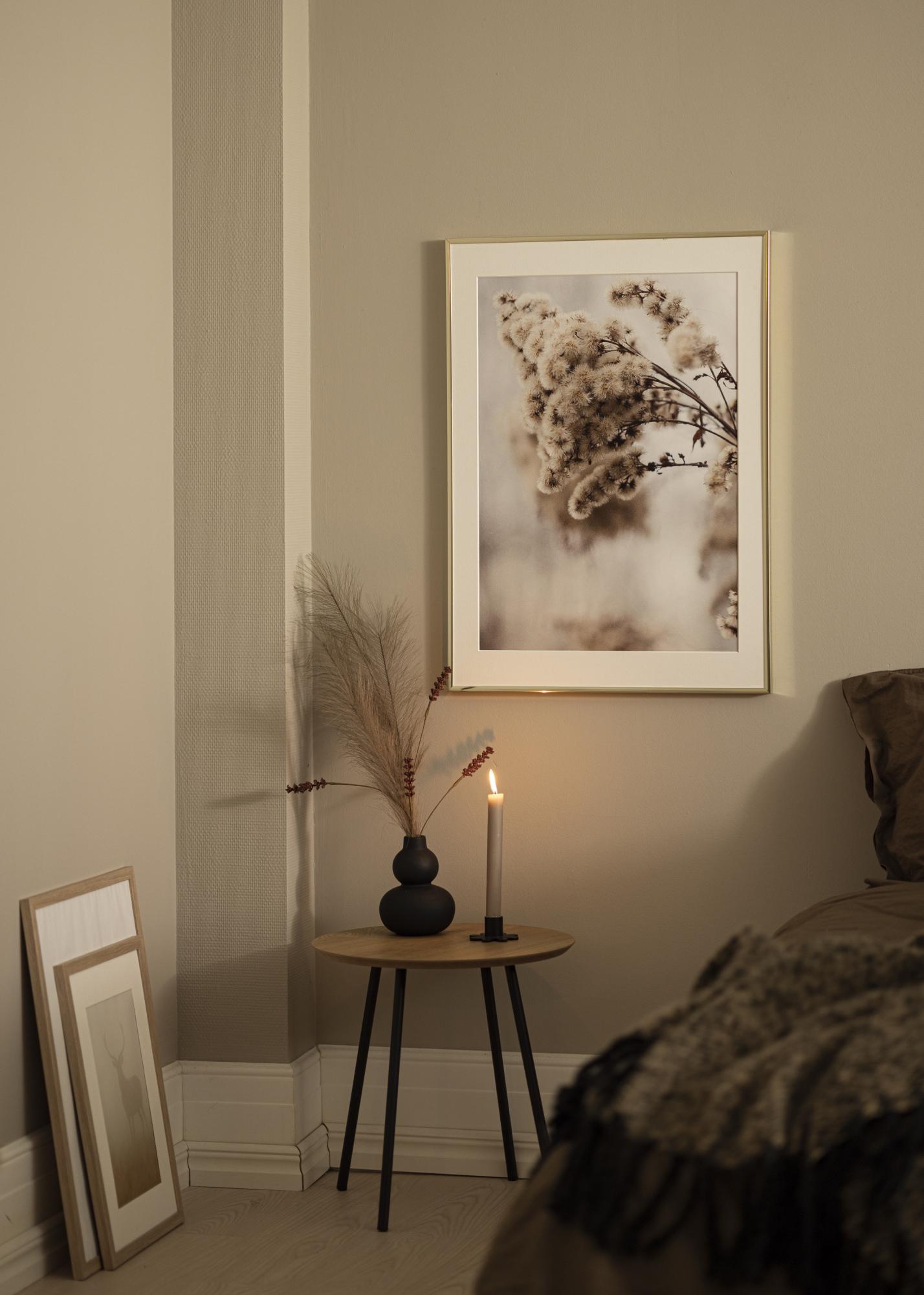 Това е тънка алуминиева рамка в стилен блестящ златист нюанс. Тънкият профил на рамката, само 9 мм, означава, че основният фокус ще бъде върху вашите мотиви. Това е перфектно, ако имате модерни постери или снимки на любими хора, които искате да заемат място на стената.