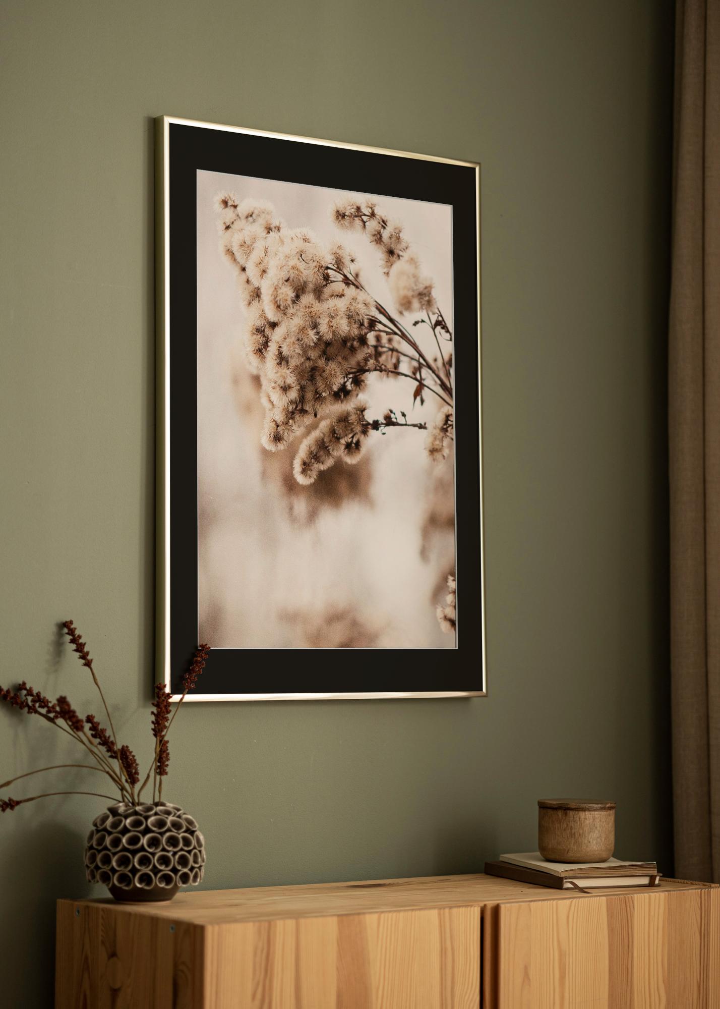 Рамката е блестяща и отразява светлината по фин начин, което усилва контраста спрямо черния паспарту. Това създава драматично оформление и привлича погледа към мотива.
