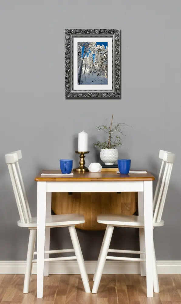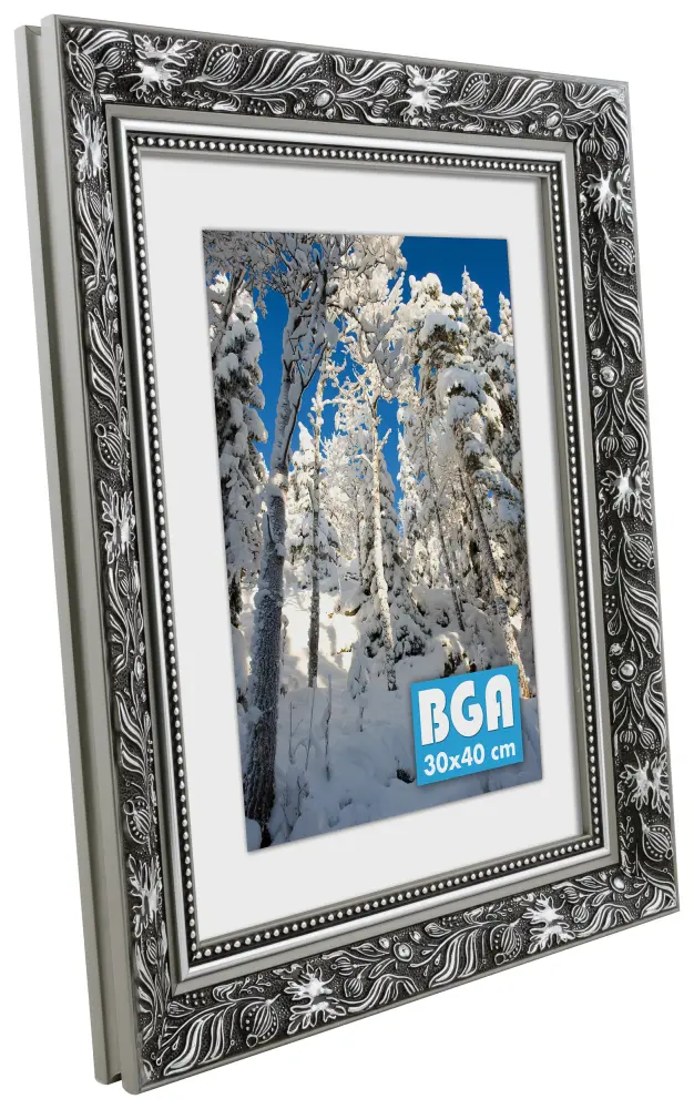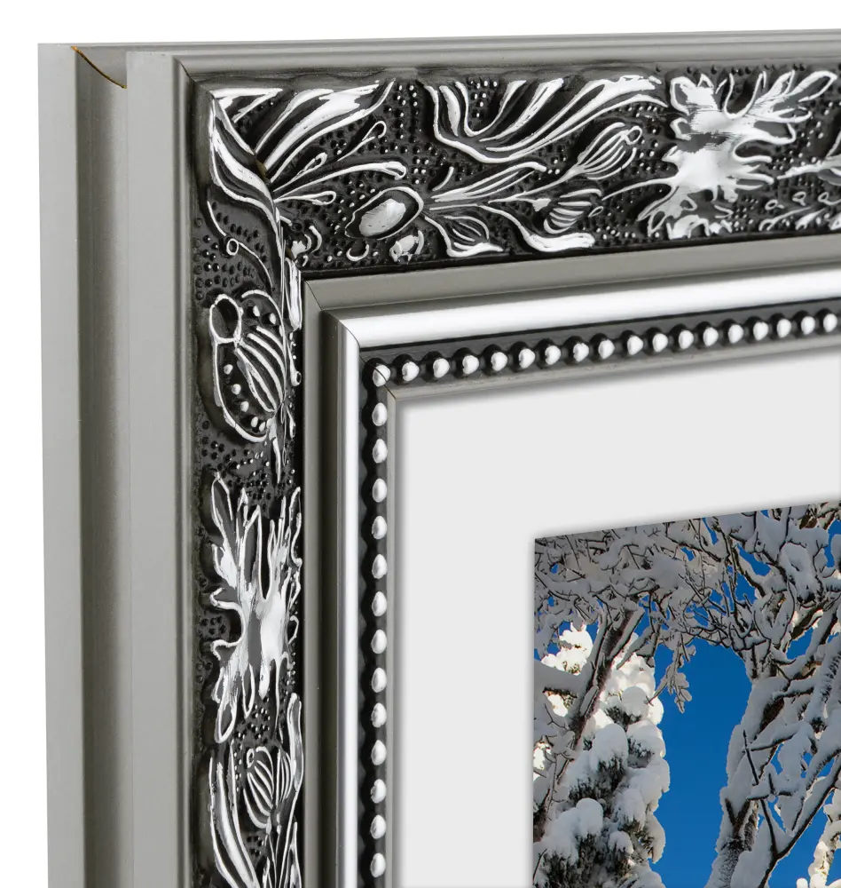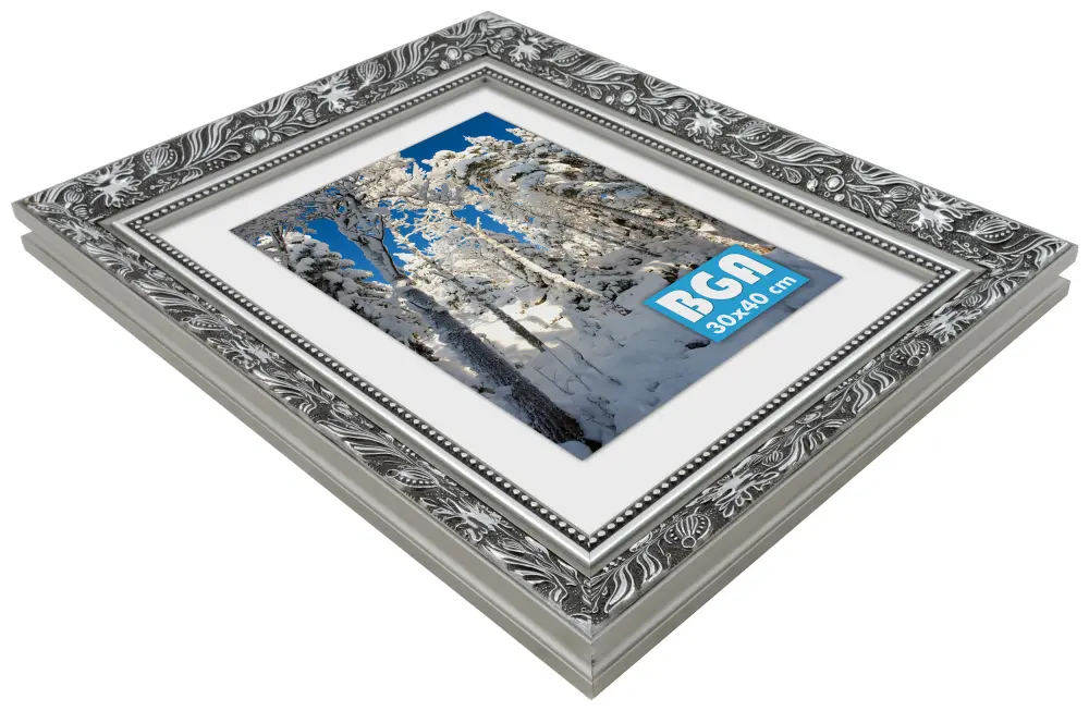 Направете стената луксозна, като едновременно с това привлечете допълнително внимание към вашата снимка! Тази красива рамка има двойно профилиране, което изглежда много добре на стената. Краищата са изцяло в сребро, докато предната част е черна и има сребрист мотив с листа и изящни форми. Близо до стъклото минава сребърен ръб и черна част с перлен мотив в сребро. Тъй като рамката се изработва според вашите запитвания за размери, можете да бъдете сигурни, че тя ще пасне точно там, където искате.