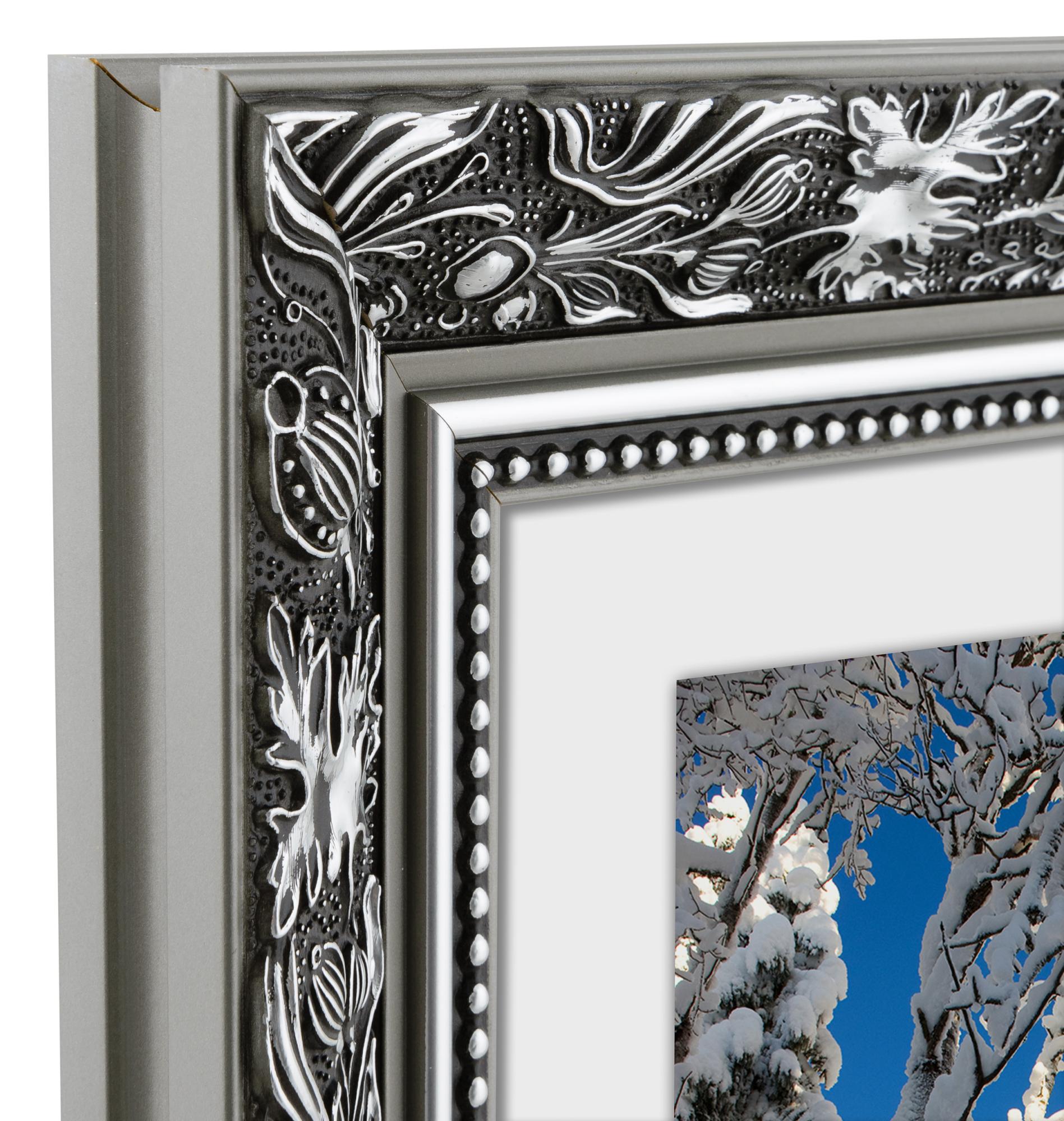 Направете стената луксозна, като същевременно привличате допълнително внимание към вашата картина! Тази красива рамка има двойно профилиране, което изглежда много добре на стената. Краищата са изцяло в сребро, докато предната част е черна и има сребрист модел с листа и извити форми. Най-близо до стъклото тече сребрист кант и черна част с перлен дизайн в сребро. Тъй като рамката се изработва по вашите размери, можете да сте сигурни, че ще пасне точно там, където желаете да я поставите.