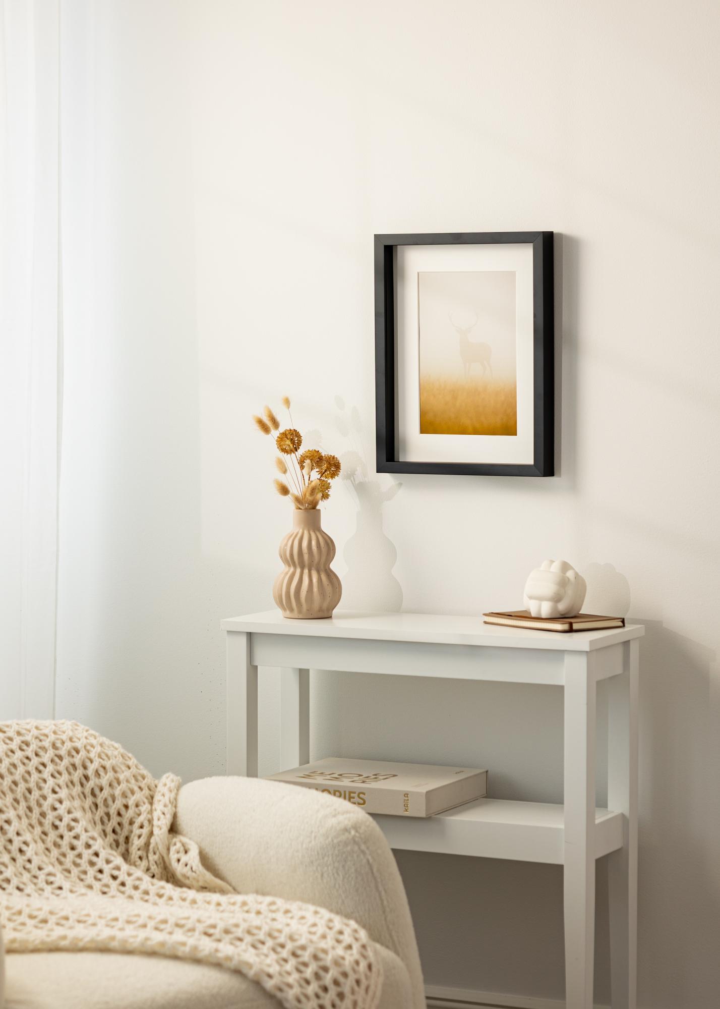 Изработена от бор, тази рамка е едновременно здрава и лека, което я прави лесна за работа и монтиране. Уникална особеност на Балдер Черен е включеният дистанционен профил. Този профил създава разстояние между стъклото и изображението, което придава дълбочина и позволява поставянето на изображението по-навътре в рамката или плаващо между стъклото и задния панел. Това създава стилно и изключително рамкиране, което наистина подчертава мотива.