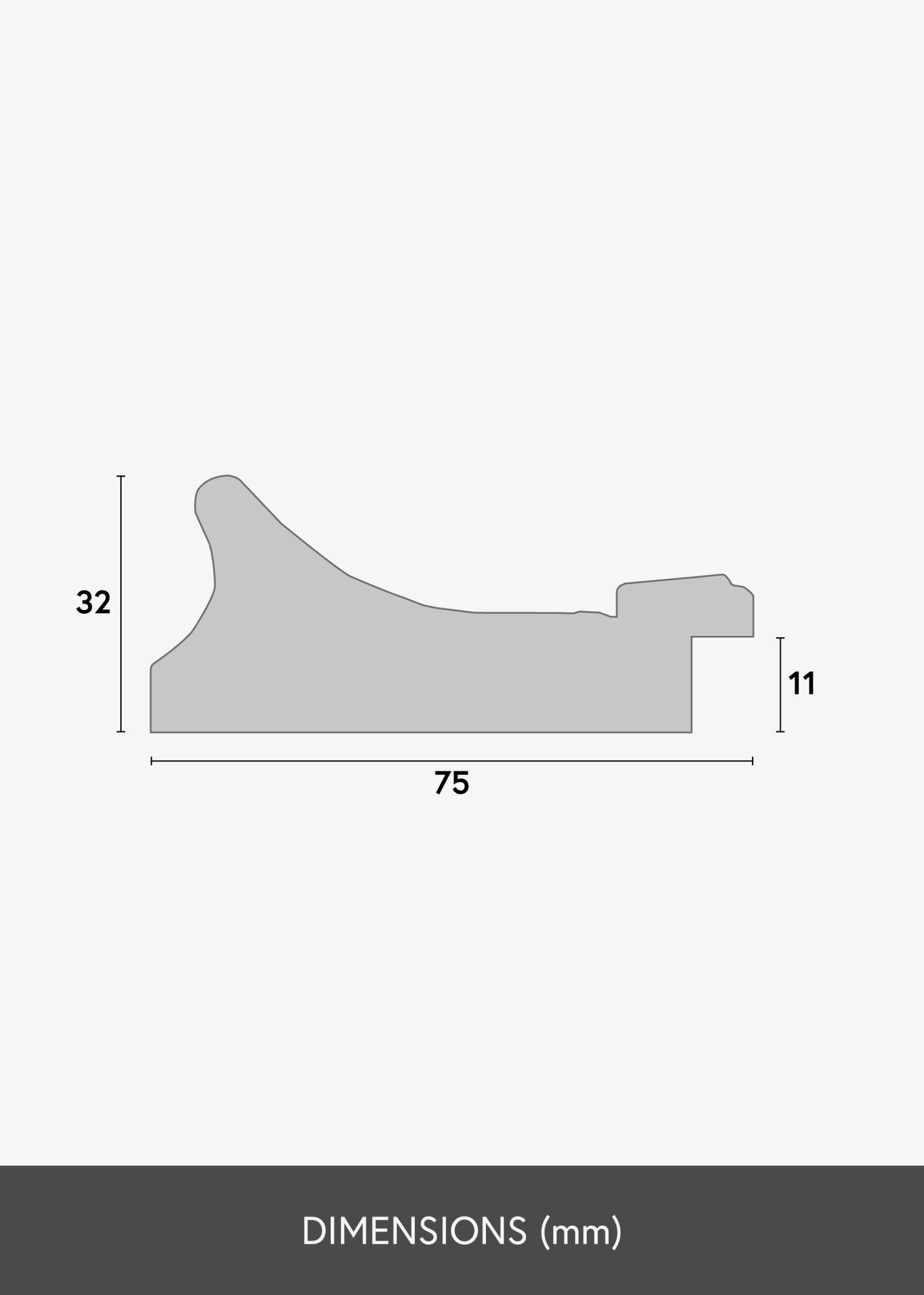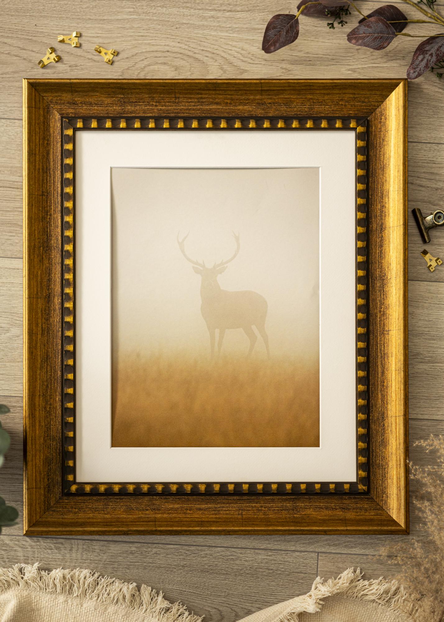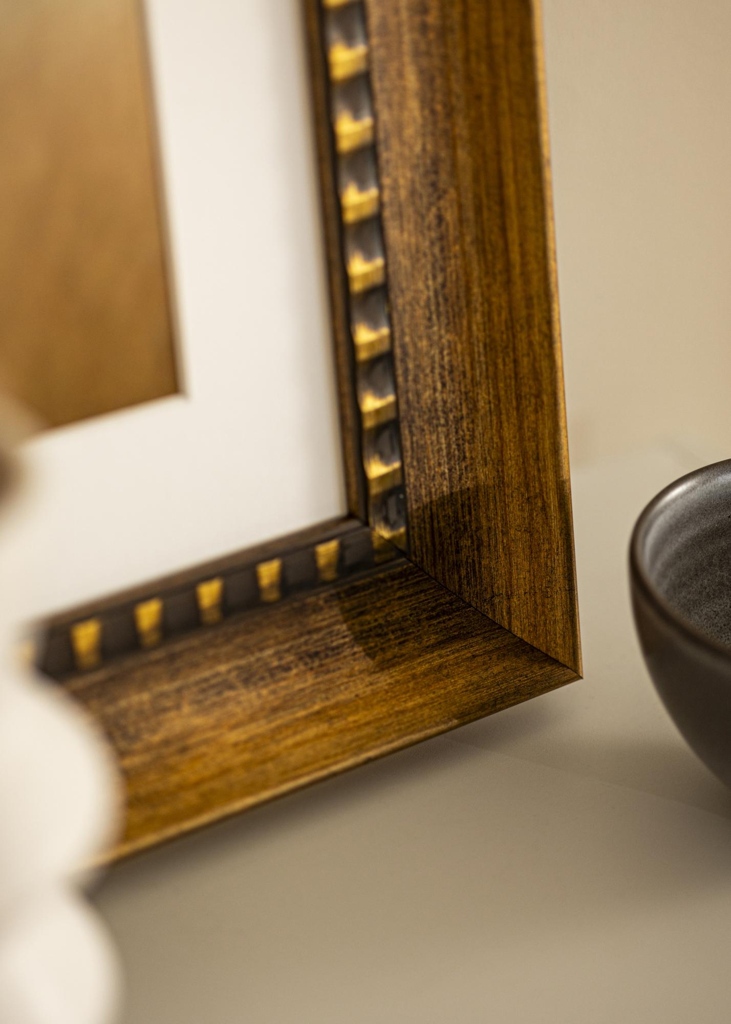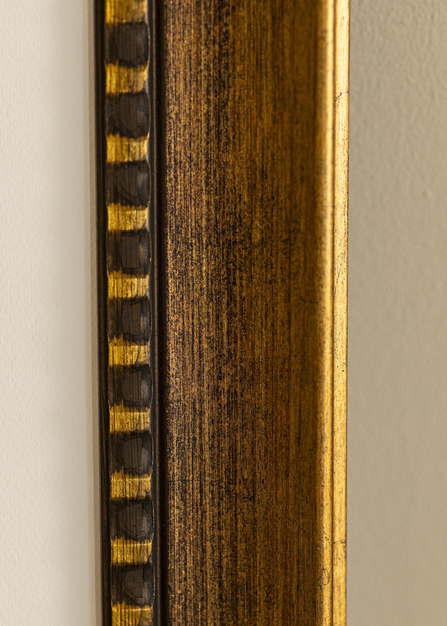 75 мм широката рамкова лайсна има деликатен блясък и е украсена с характерни райетни детайли в злато и черно по вътрешния край. Това придава на рамката уникален характер и я прави идеална за подчертаване на класически и традиционни произведения на изкуството. Дървената структура е видима и добавя селски усет, докато мекото златно крайче добавя нотка на елегантност.