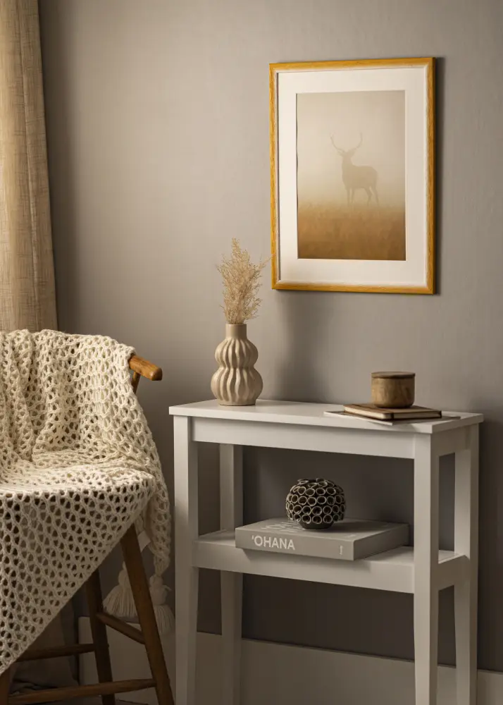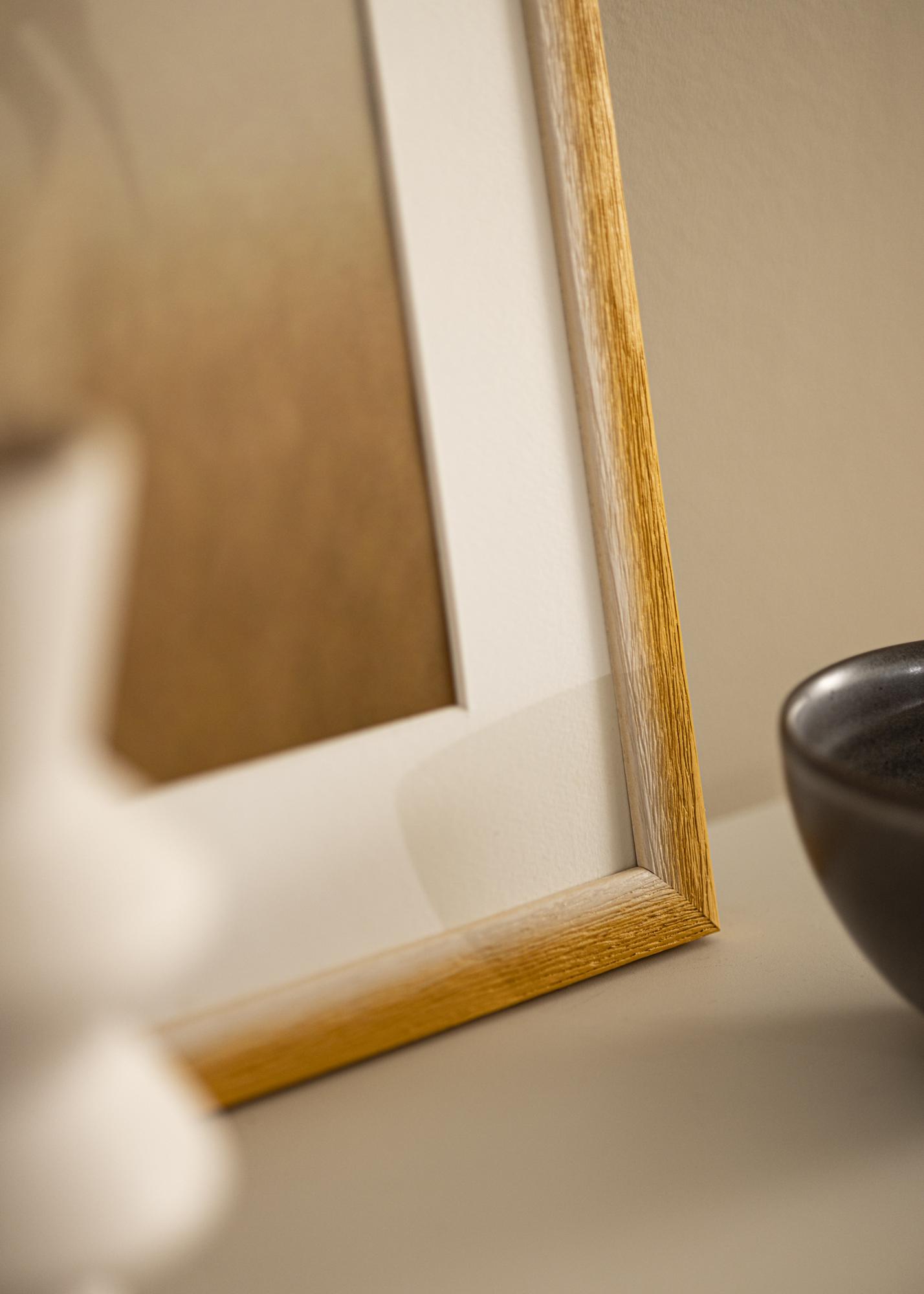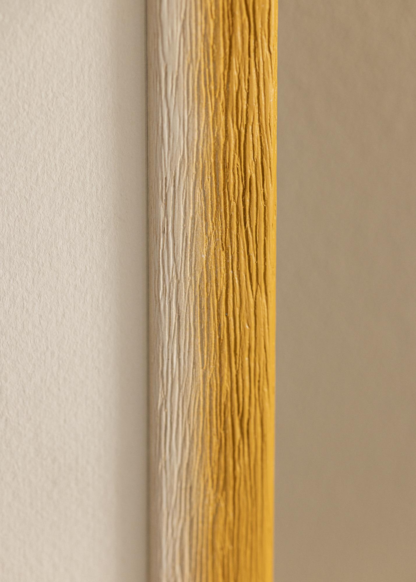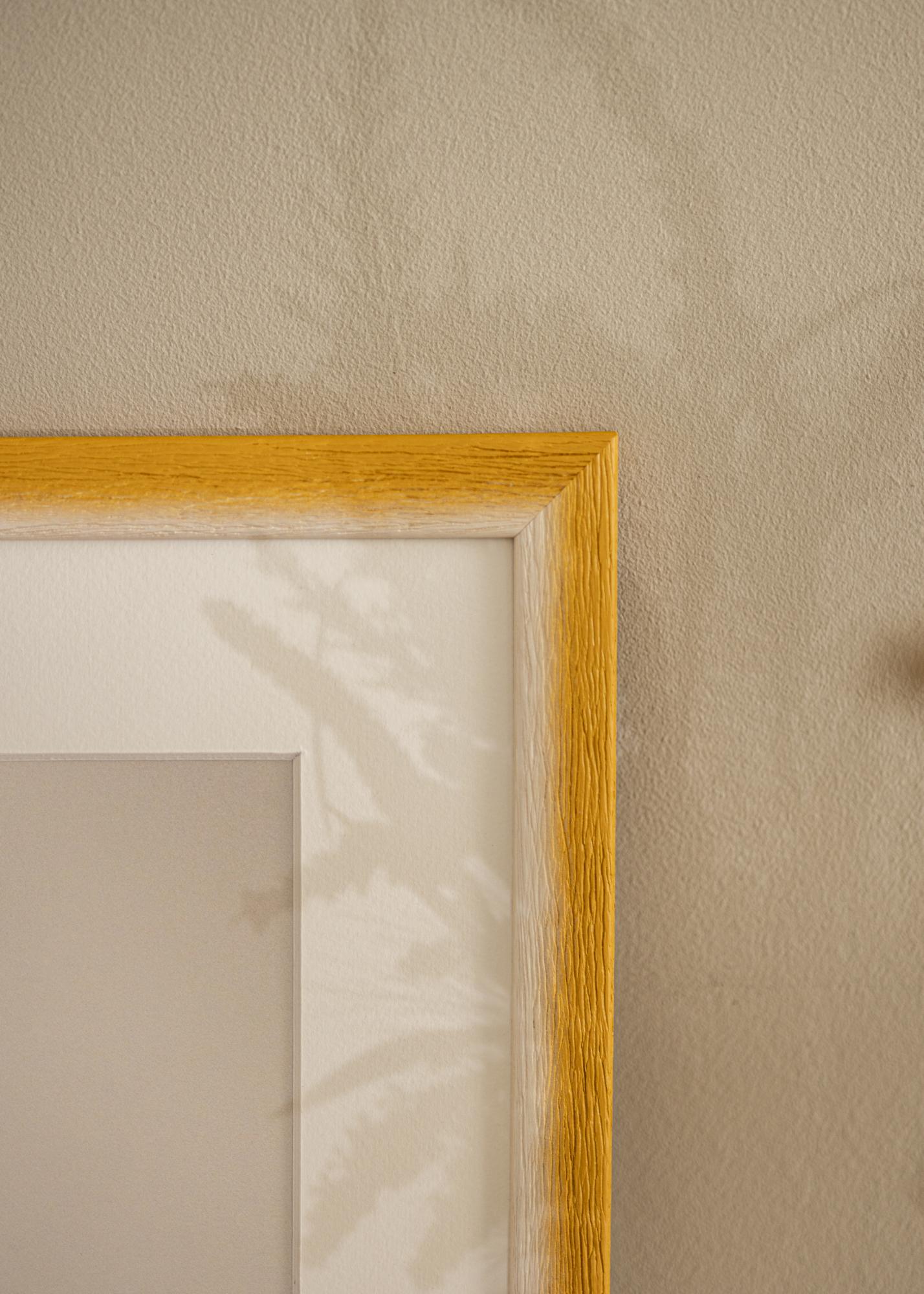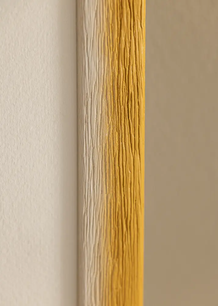 Тази рамка за картини има хармоничен преход на цветовете от светъл, естествено бял тон до топъл охра жълт нюанс. Повърхността е с изразена дървена структура с дълбоки жилки, което придава тактилно и естествено усещане. Незабележимият преход между цветовете създава меко, боядисано излъчване с живо дълбочина, което подчертава всяко изображение.