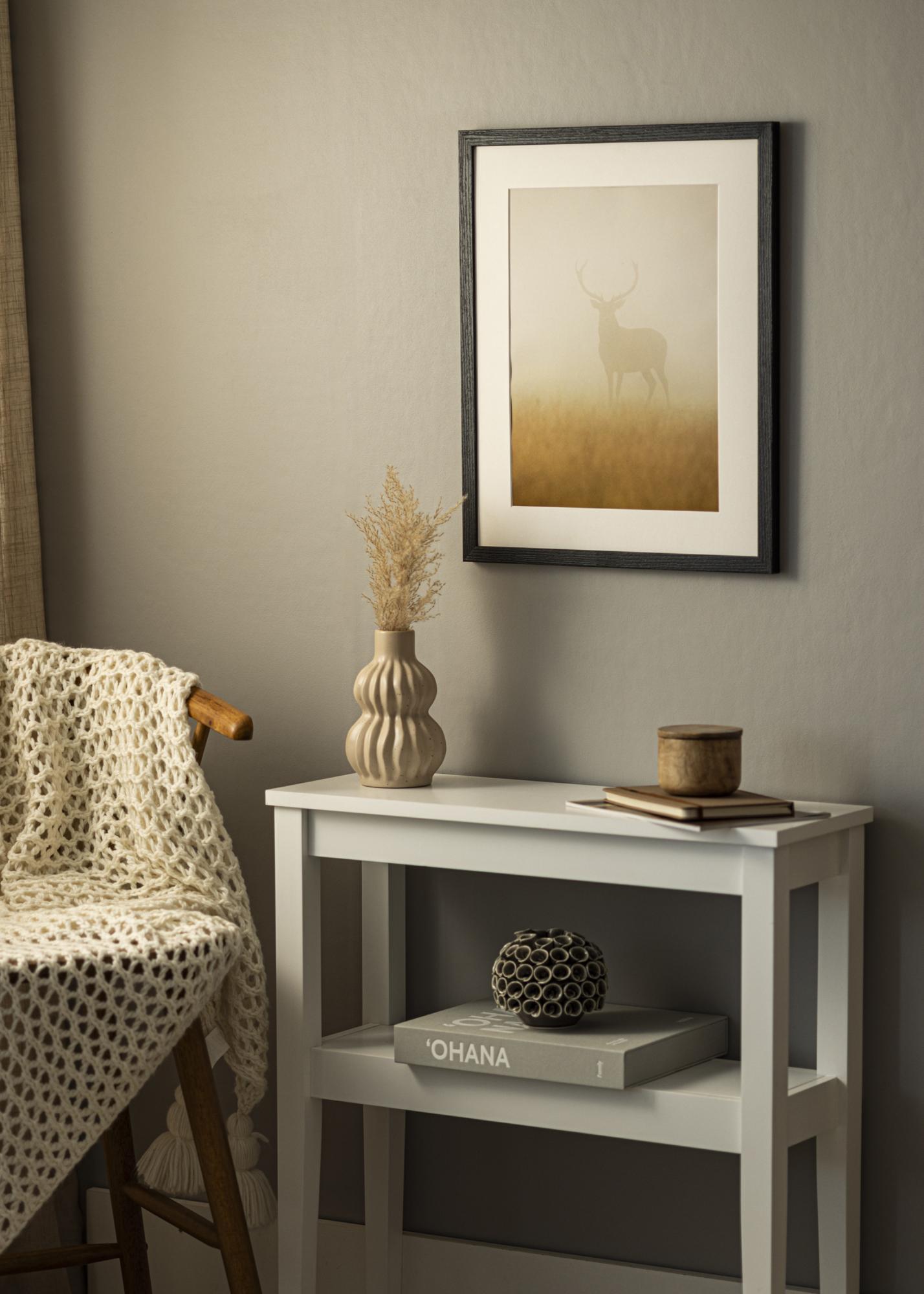 Devon Черен има рамка с ширина 20 мм и дълбочина 20 мм, което осигурява стабилно и здраво рамкиране. Изработена от аьос дърво, тази рамка за картини е едновременно издържлива и естетически привлекателна. Всяка рамка се създава в нашата собствена рамкова работилница, което гарантира високо качество и прецизност във всеки детайл.