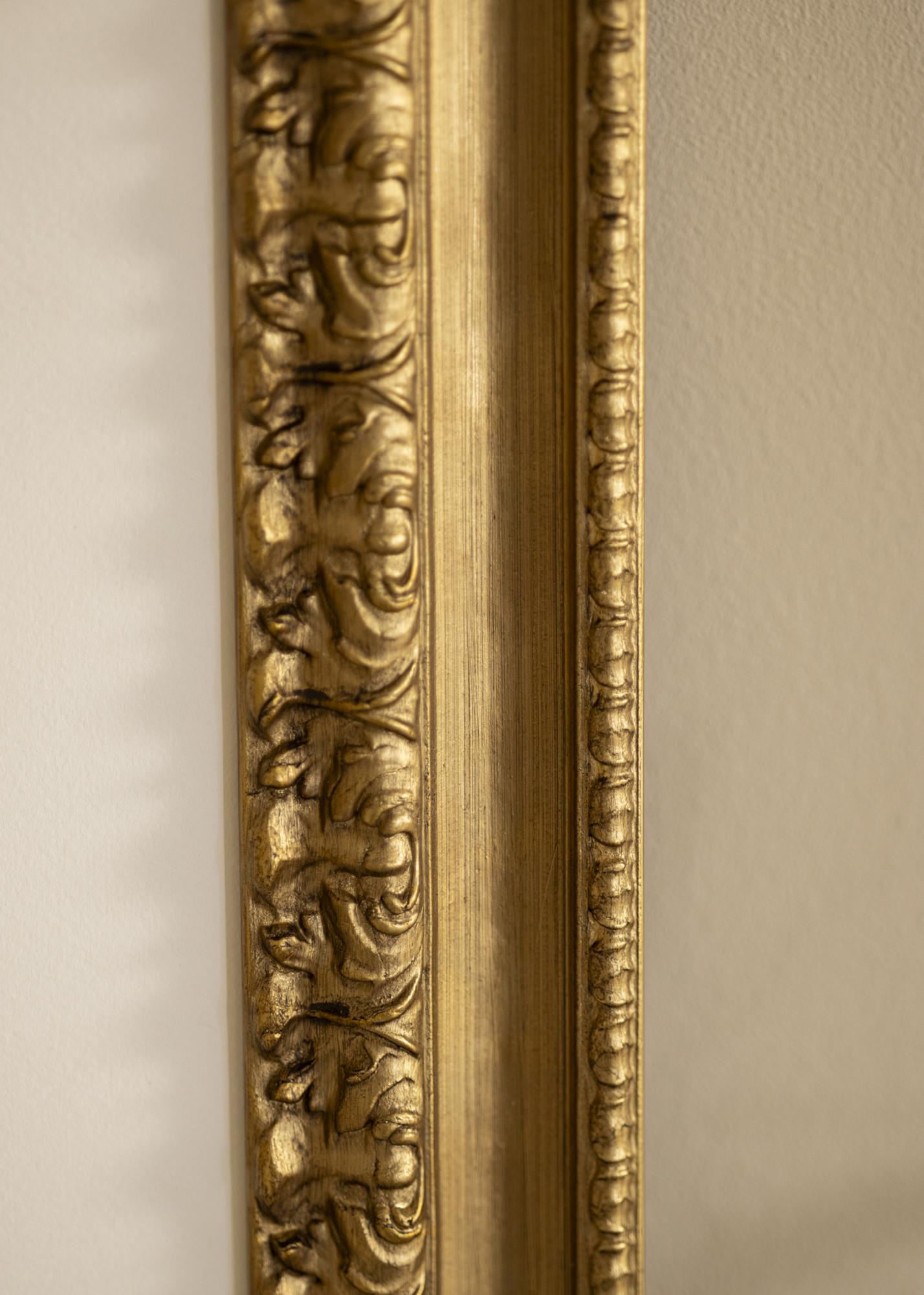 Рамка Drottningholm Guld III е елегантна и стилна фоторамка, която придава на вашите снимки кралска обстановка. Със златистия си финиш и детайлната, скулптурна декорация по вътрешния ръб, тази картина рамка е красиво допълнение към всяка стая. Мекото четкане на повърхността подчертава релефната шарка и придава на рамката леко застарял характер, създавайки усещане за вечна елегантност.