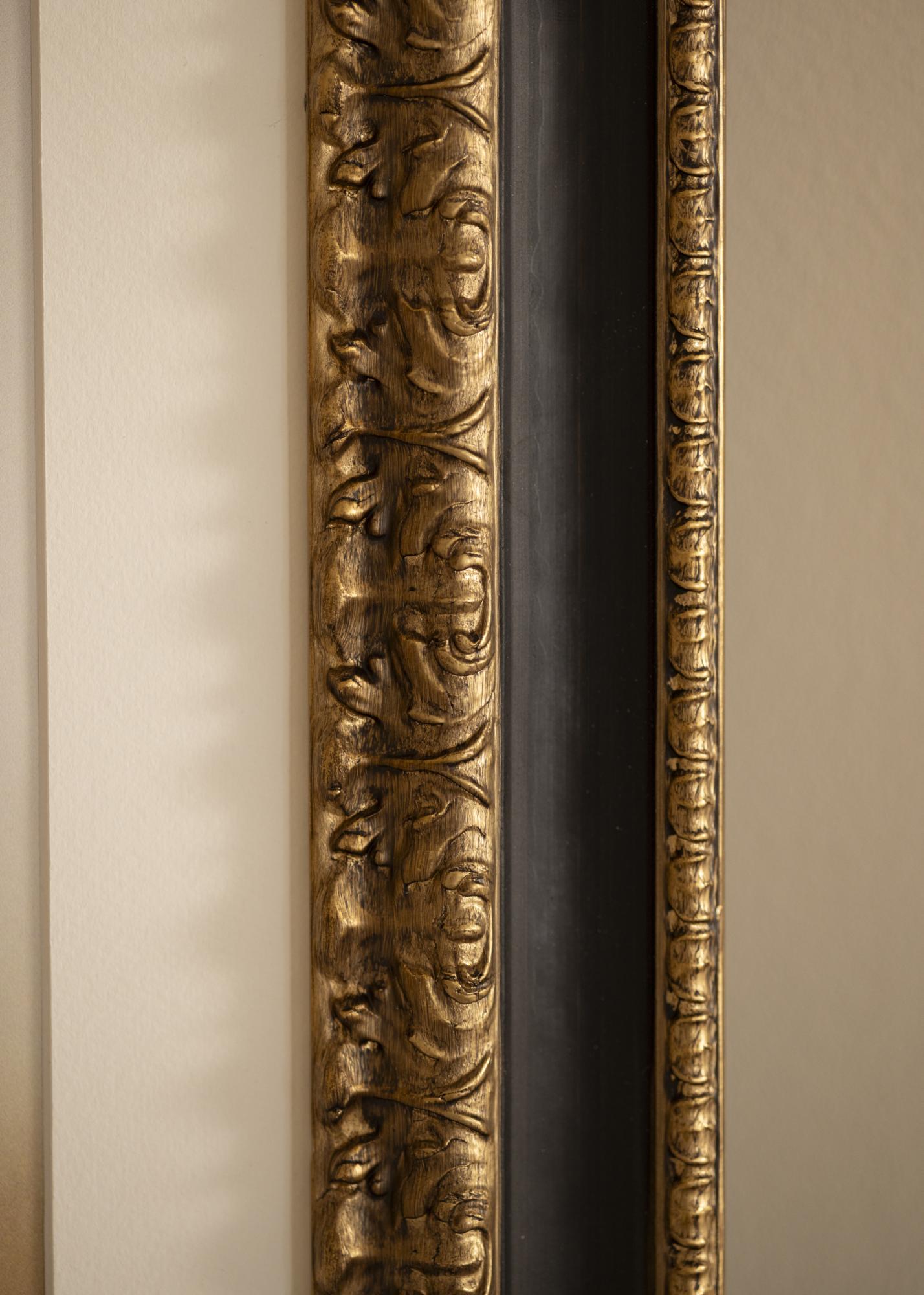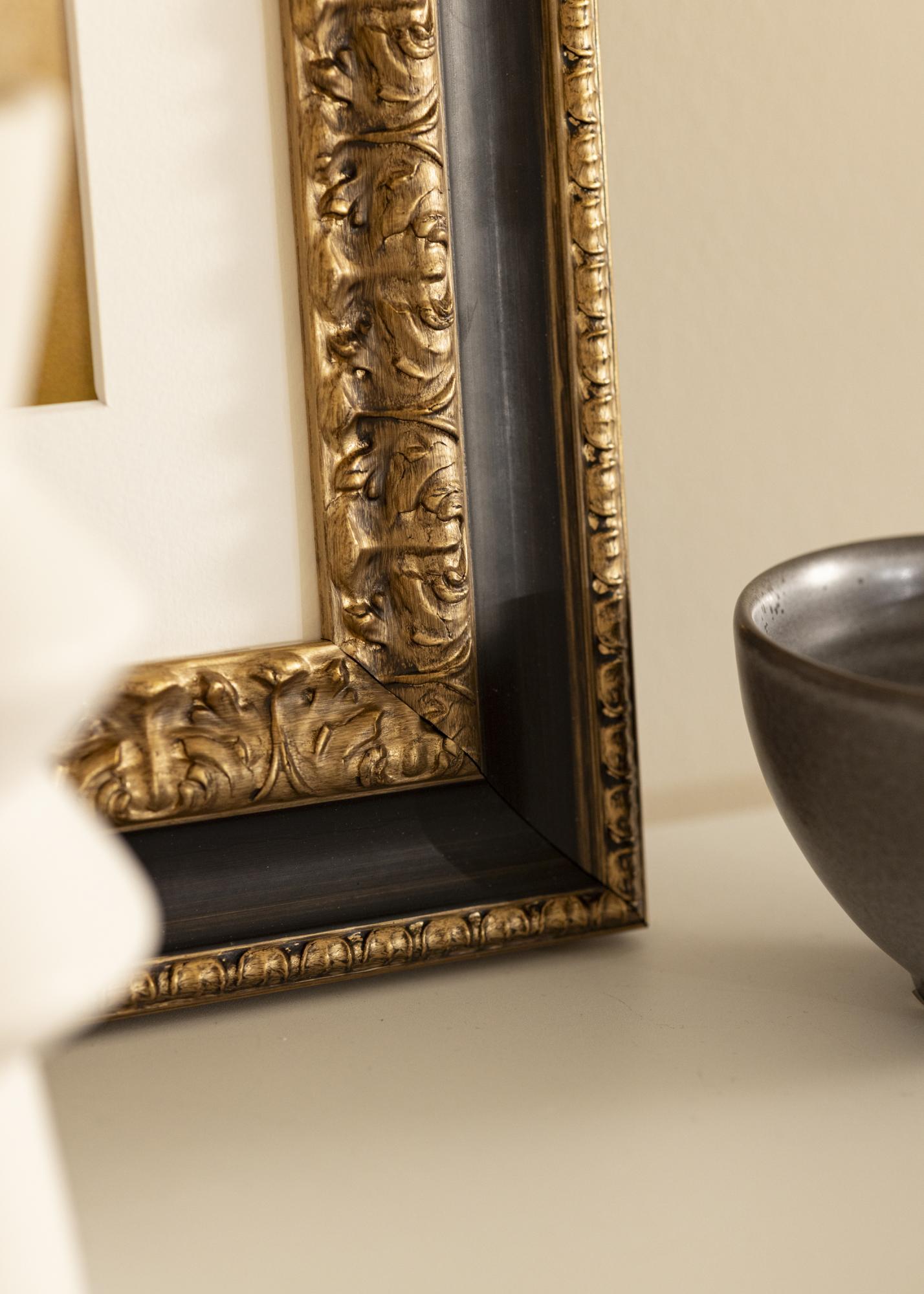 "Drottningholm Guld" е красива ретро рамка от Италия, изработена от фурнир от свързани с пръсти дървени елементи, която е ръчно боядисана. Рамката има богато декориран златен профил с широка черна граница, която придава на рамката елегантен вид. Идеална за всякакви видове рамкиране в ретро стил.