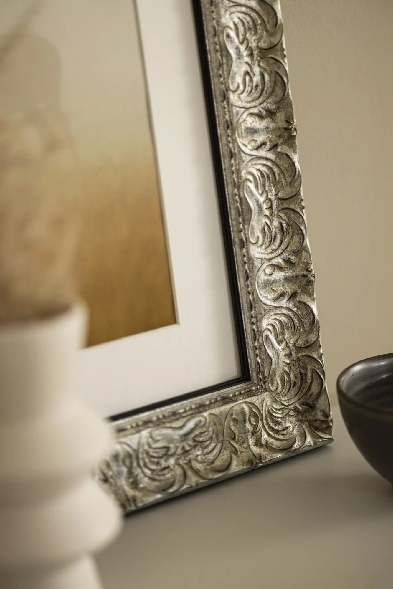 Рамка Durham Silver е елегантна и стилна фоторамка, която придава на вашите снимки изискана рамка. Със своята сребриста повърхност и антично покритие тя създава рустикален, но все пак модерен усещане във вашия дом. Орнаментираната релефна повърхност на рамката допринася за нейната уникална характеристика и я прави идеален избор за подчертаване на вашите любими фотографии или произведения на изкуството.