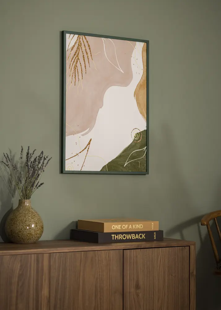 Това е рамка, произведена в Швеция, която е в прекрасен зелен нюанс. Рамката измерва 70x100 см и е изработена от дърво. Листът на рамката е с размери 12 мм ширина и 20 мм дълбочина. Тази рамка има акрилно стъкло, което е вид прозрачен пластмасов материал, наподобяващ стъкло, но не е толкова крехък. Избирайки рамки в цветен нюанс, можете лесно да създадете контраст с основните цветове в стаята и зелената рамка изглежда особено добре за естествени изображения, семейни снимки и също така мотиви, които няма толкова много цвят в тях! Има монтиране за стена както за вертикално, така и за хоризонтално окачване.