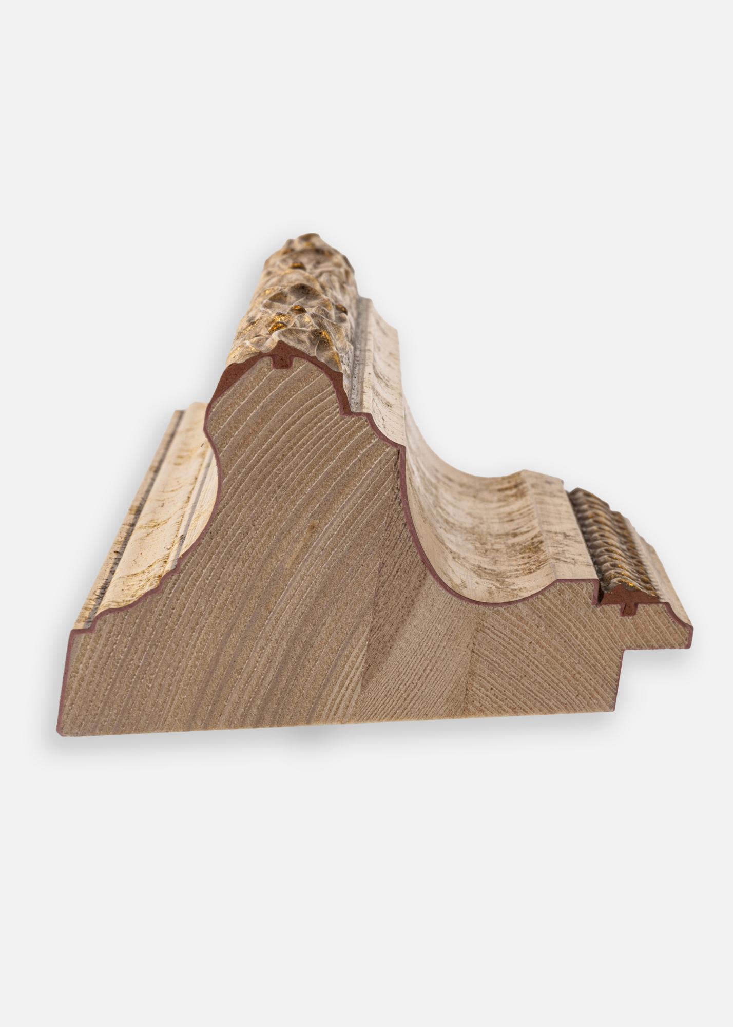 Широкият профил от 102 мм придава на рамката впечатляващо присъствие, докато нейната дълбочина от 56 мм създава здрава и стабилна рамка. Малките перловидни орнаменти по вътрешния ръб добавят една финна, класическа нотка, която подчертава цялостното впечатление. Външният ръб е украсен с вълнообразен листен мотив, който придава изискана и вечна характеристика на рамката.