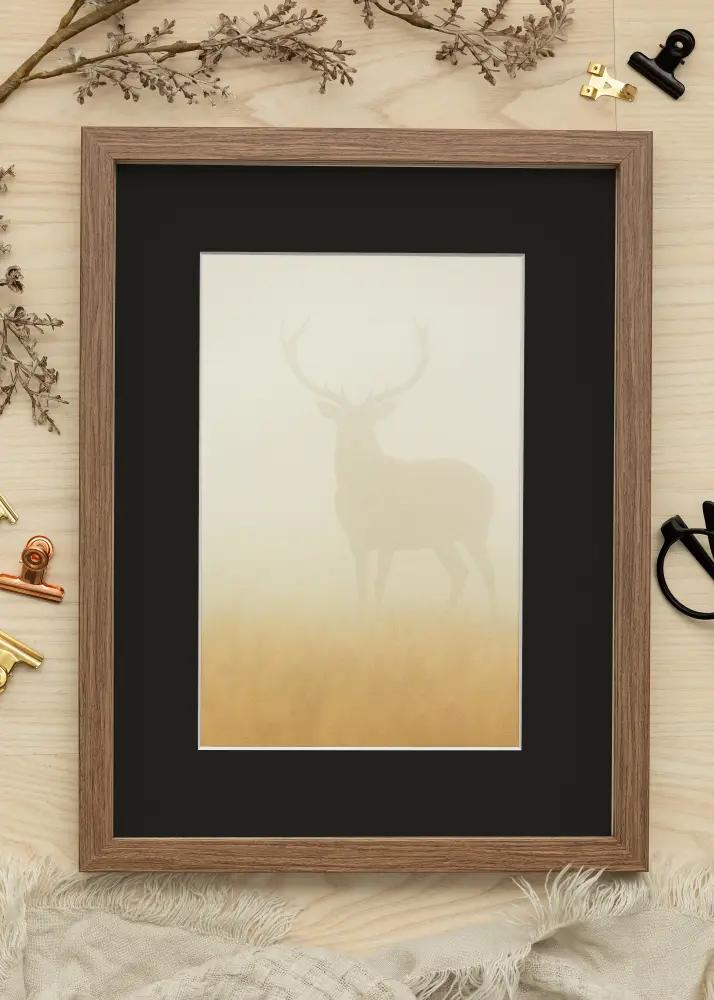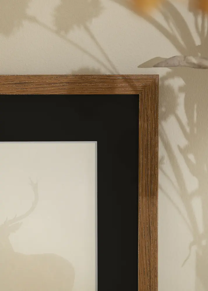 Дайте на любимите си снимки вниманието, което заслужават, с елегантна кафява рамка, комплектована с черно паспарту. Тази изискана комбинация подчертава контраста и дълбочината на вашата фотография или произведение на изкуството, докато черното паспарту създава визуална пауза, която привлича окото на наблюдателя към изображението. Паспартуто добавя и професионален завършек към вашата рамка и е идеално за подчертаване на детайли и цветове.