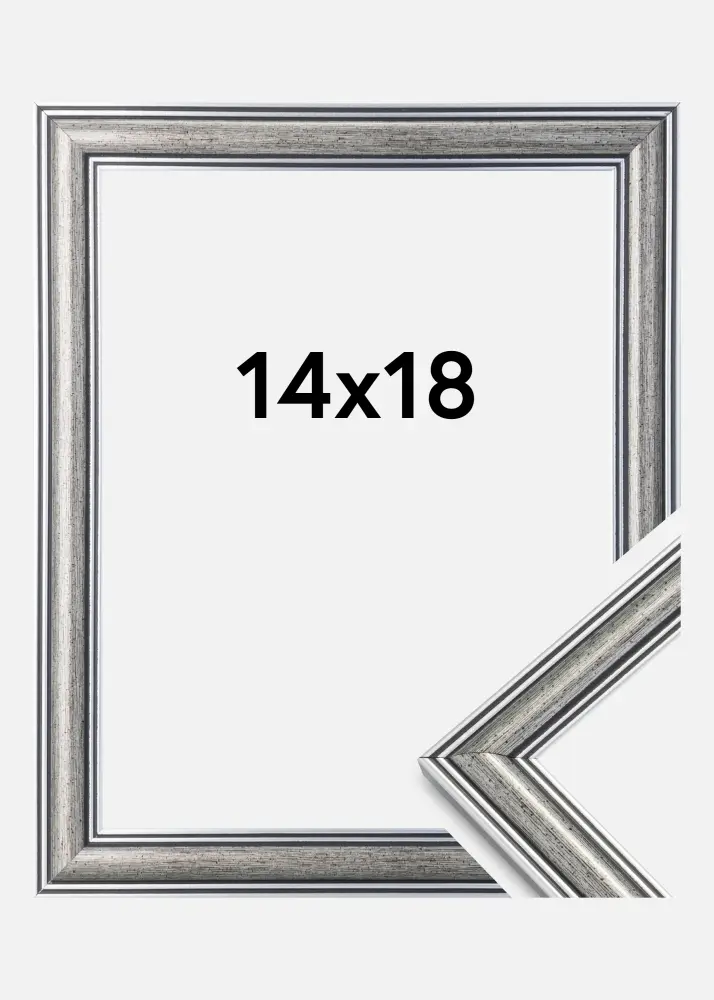 Frigg е сребърна рамка с черни линии и черни напукани елементи. Подходяща е, когато търсите широка традиционна сребърна рамка, която пасва на много видове изображения и среди.