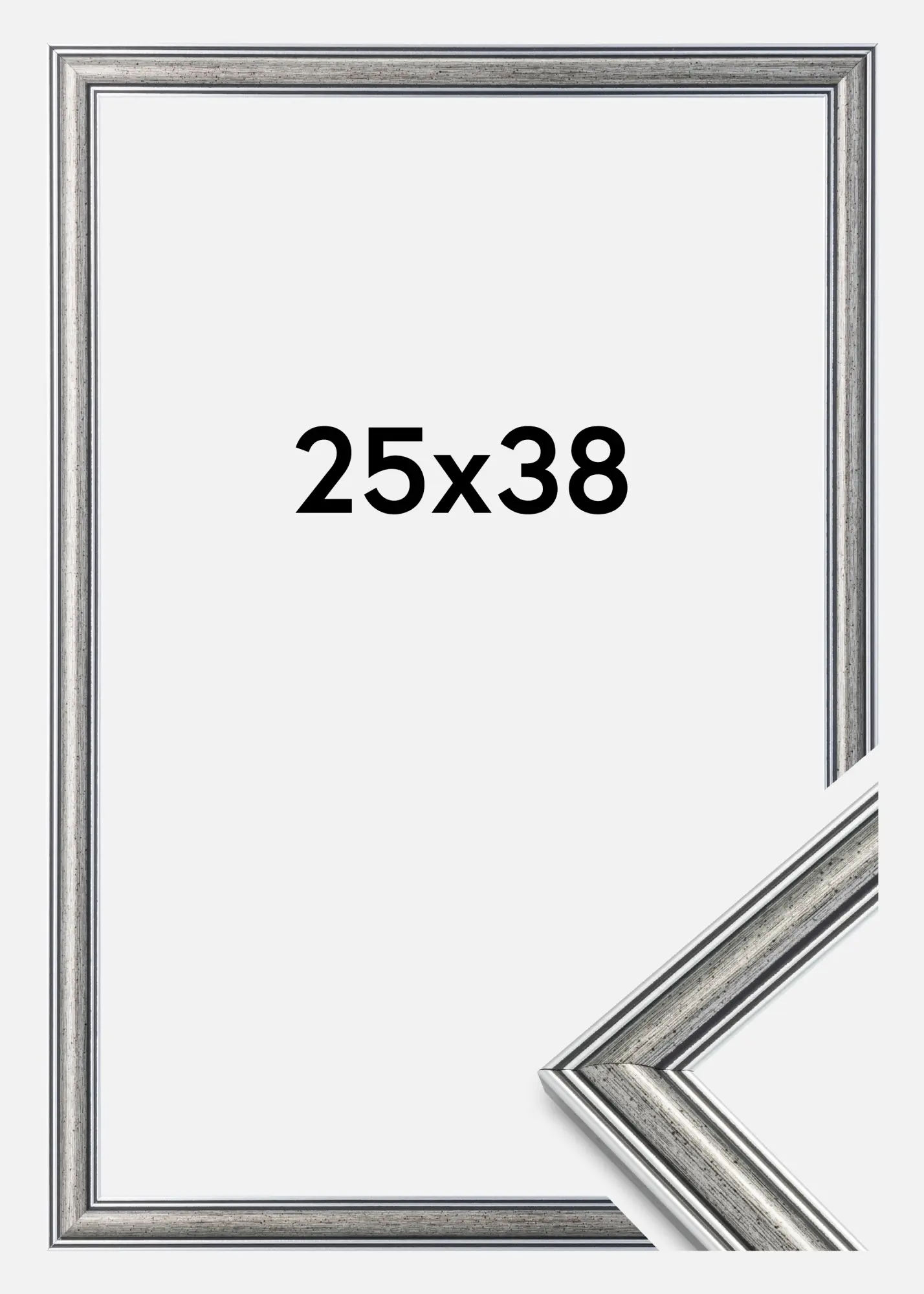Frigg е сребърна рамка с черни линии и черни пръски. Подходяща е, когато търсите широка традиционна сребърна рамка, която пасва на много видове изображения и среди.