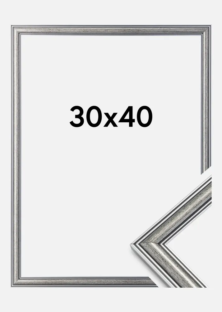 Frigg е сребърна рамка с черни линии и черни пръски. Подходяща е, когато търсите широка традиционна сребърна рамка, която пасва на много видове изображения и среди.