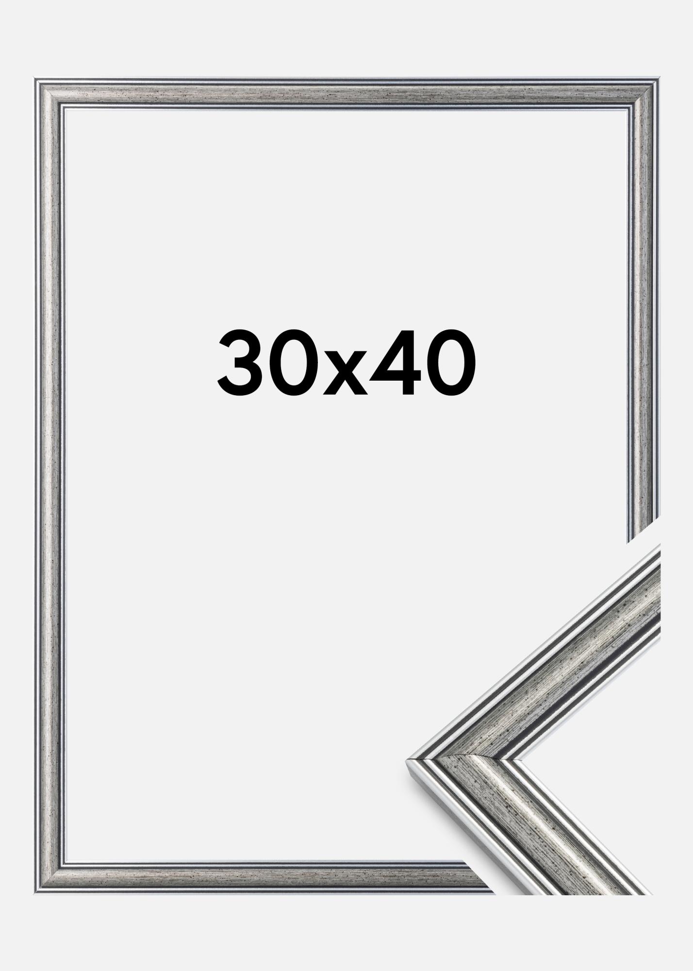 Стартирайте избора на рамка »Frigg е сребърна рамка с черни линии и черни пръски. Подходяща е, когато търсите широка традиционна сребърна рамка, която пасва на много видове изображения и среди.