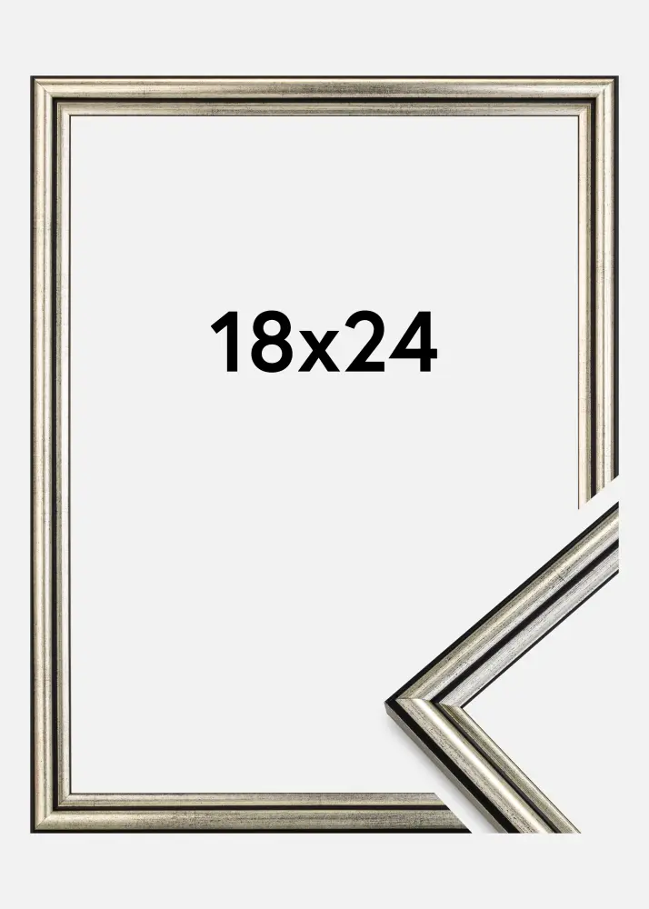 Открийте елегантността в простотата с нашата сребърна рамка 18x24 см, елегантна рамка за картини, която допълва вашите любими снимки или произведения на изкуството. Дизайнът на рамката е уникален със своите черни детайли на пръски и черни линии, които придават изискано впечатление. С рамков профил с ширина 15 мм и дълбочина 14 мм, тази фоторамка създава отличителна рамка около вашия мотив.