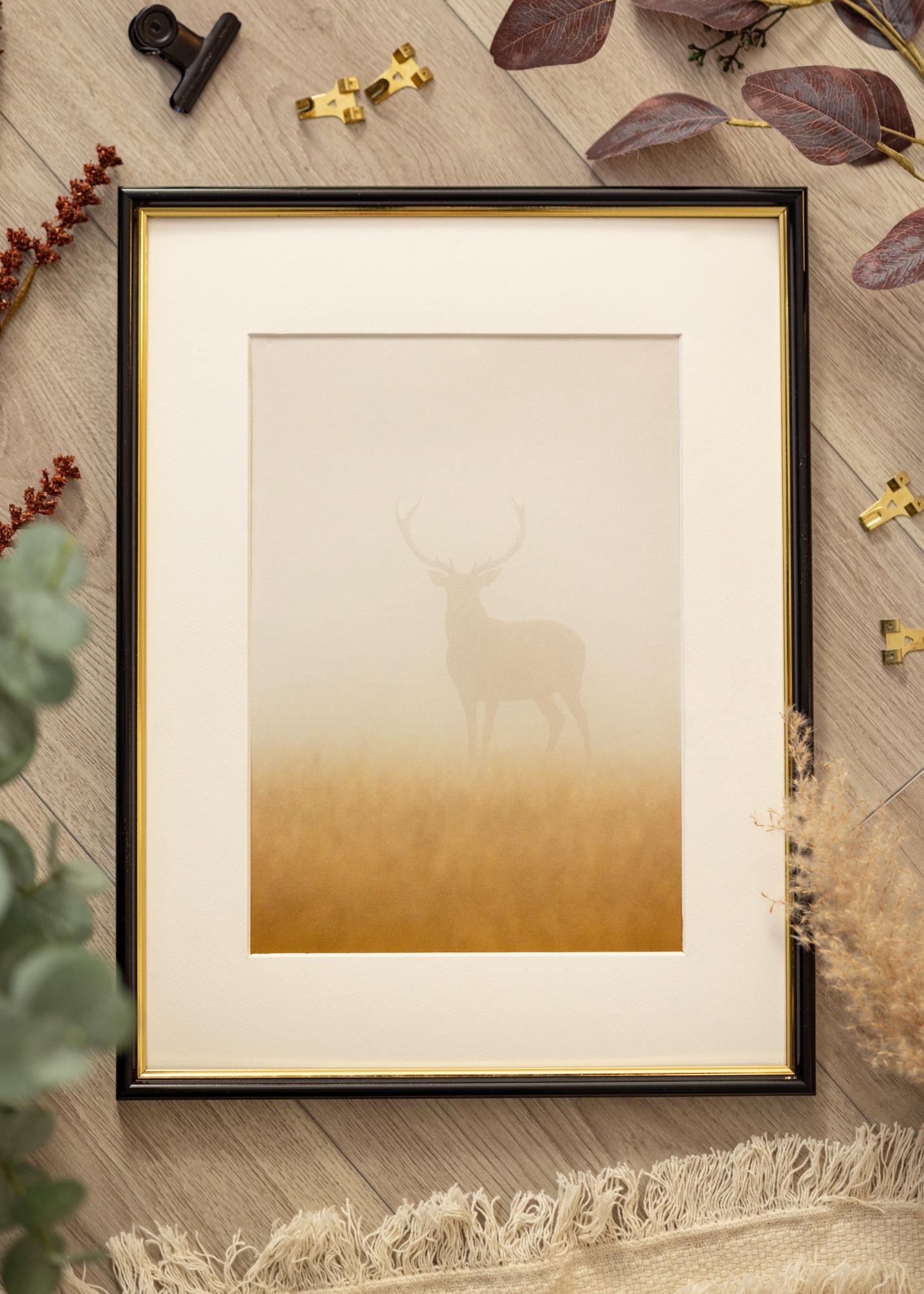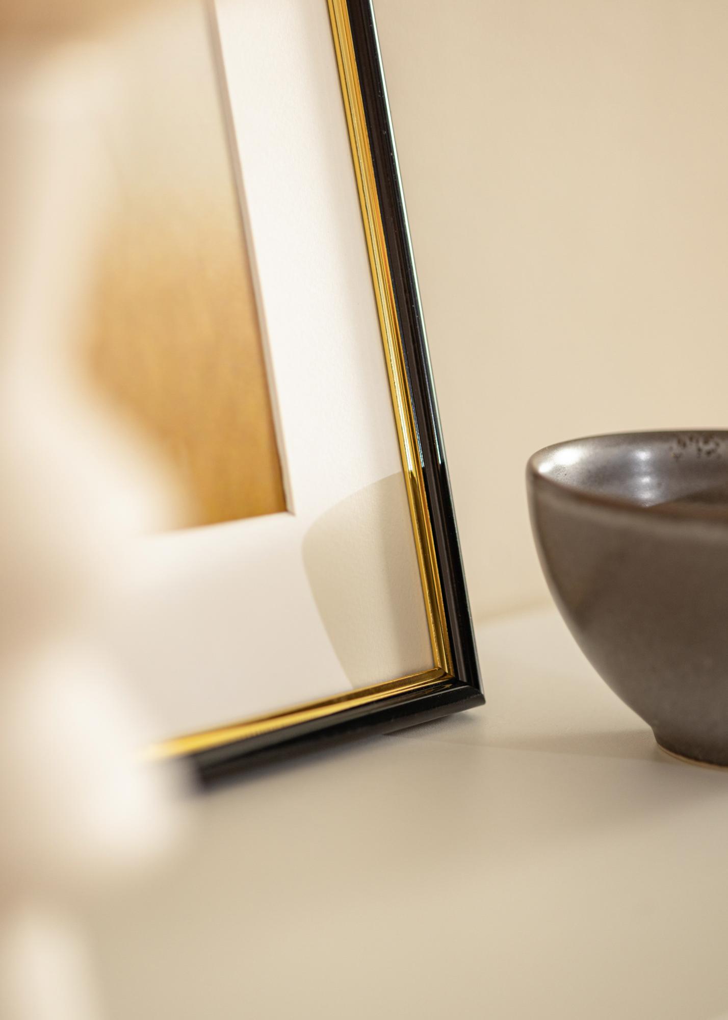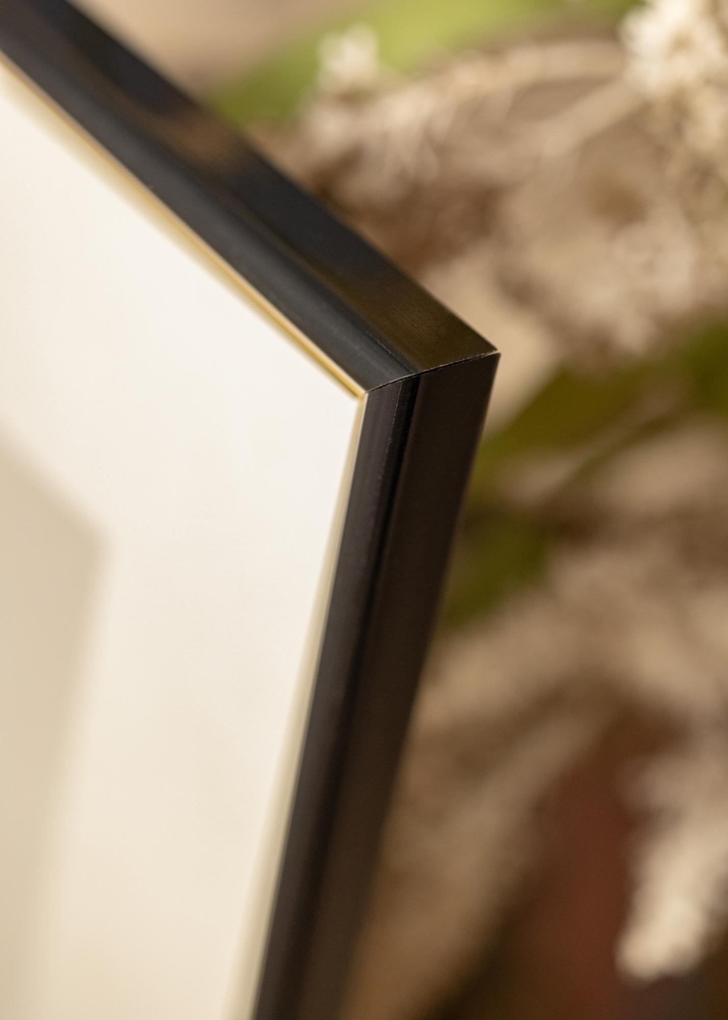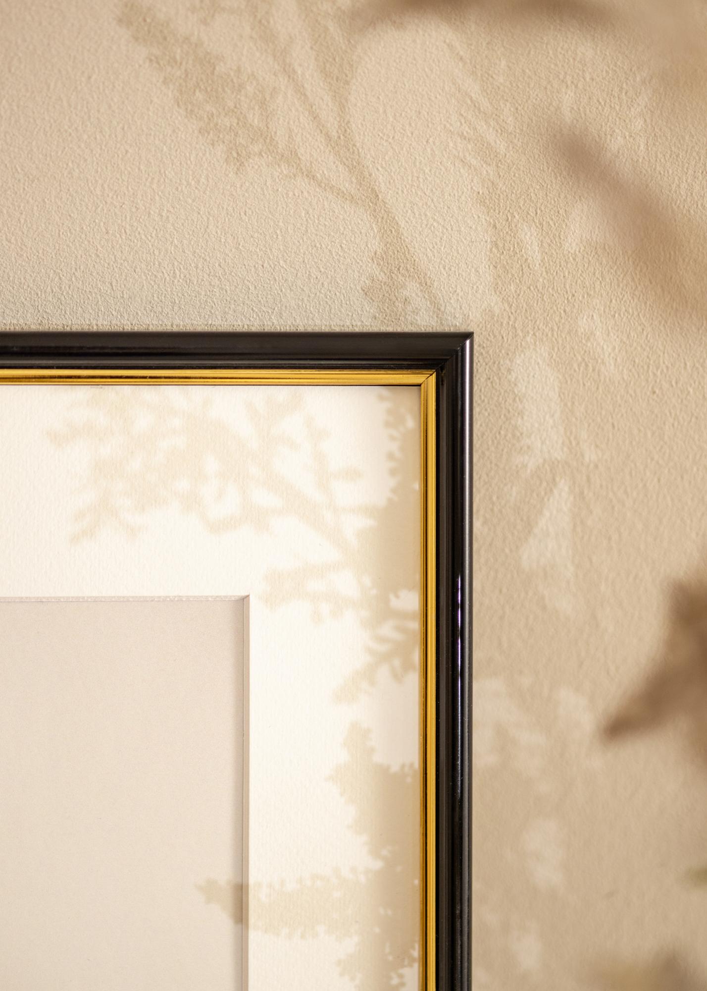 Джаз Черно има класически дизайн със златист вътрешен кант, който придава елегантен вид на рамкираната картина.