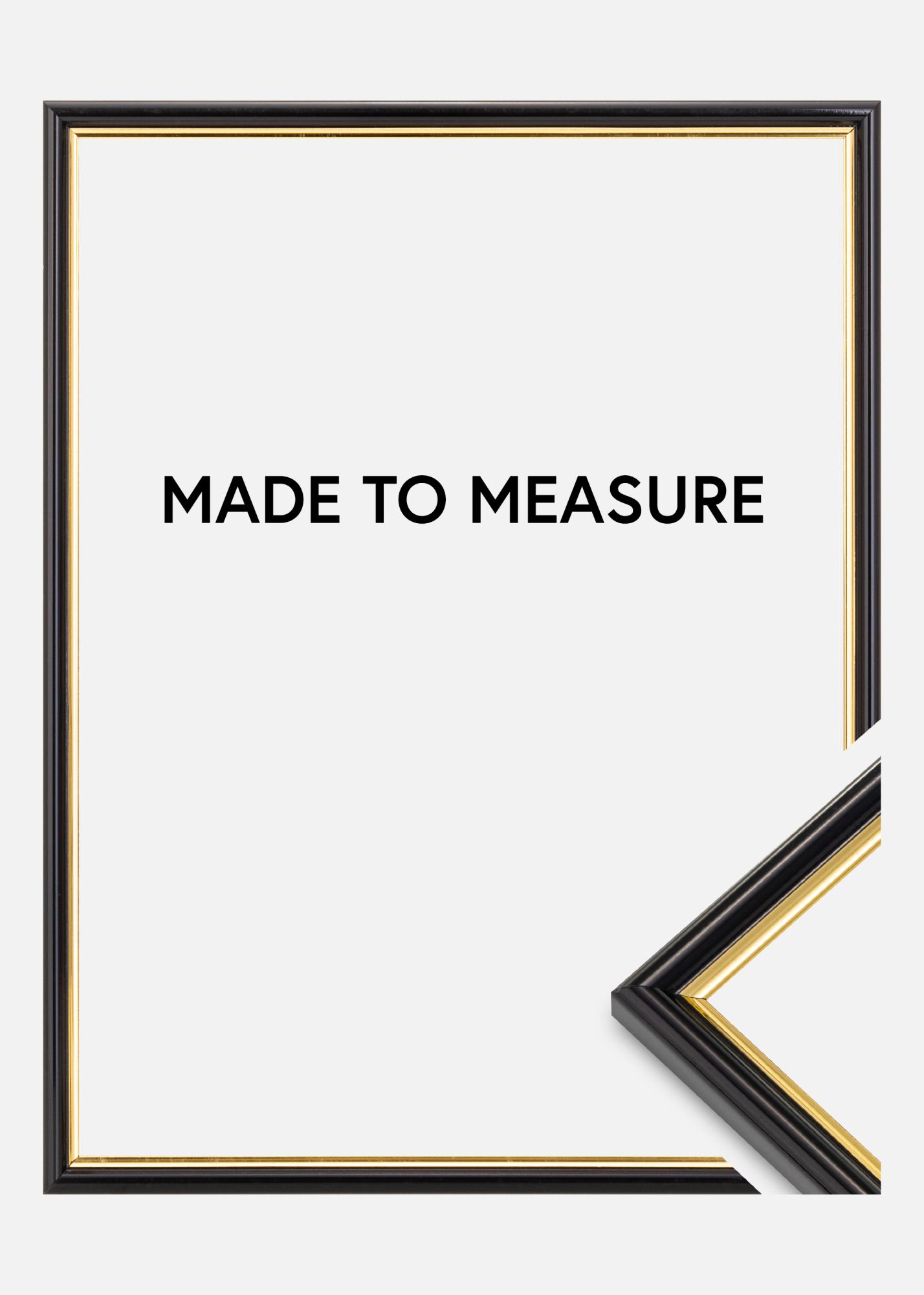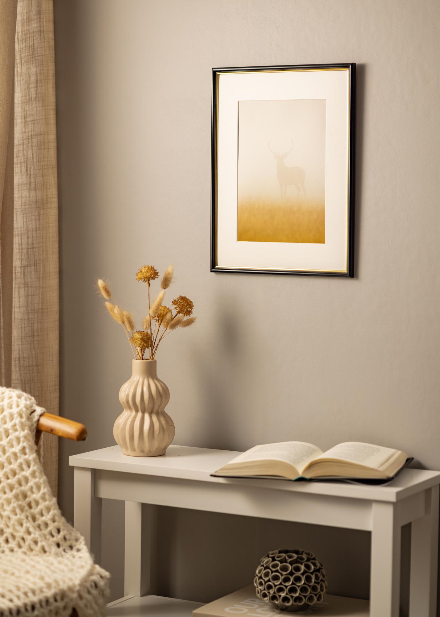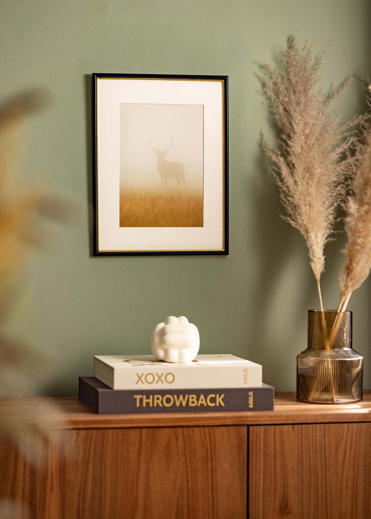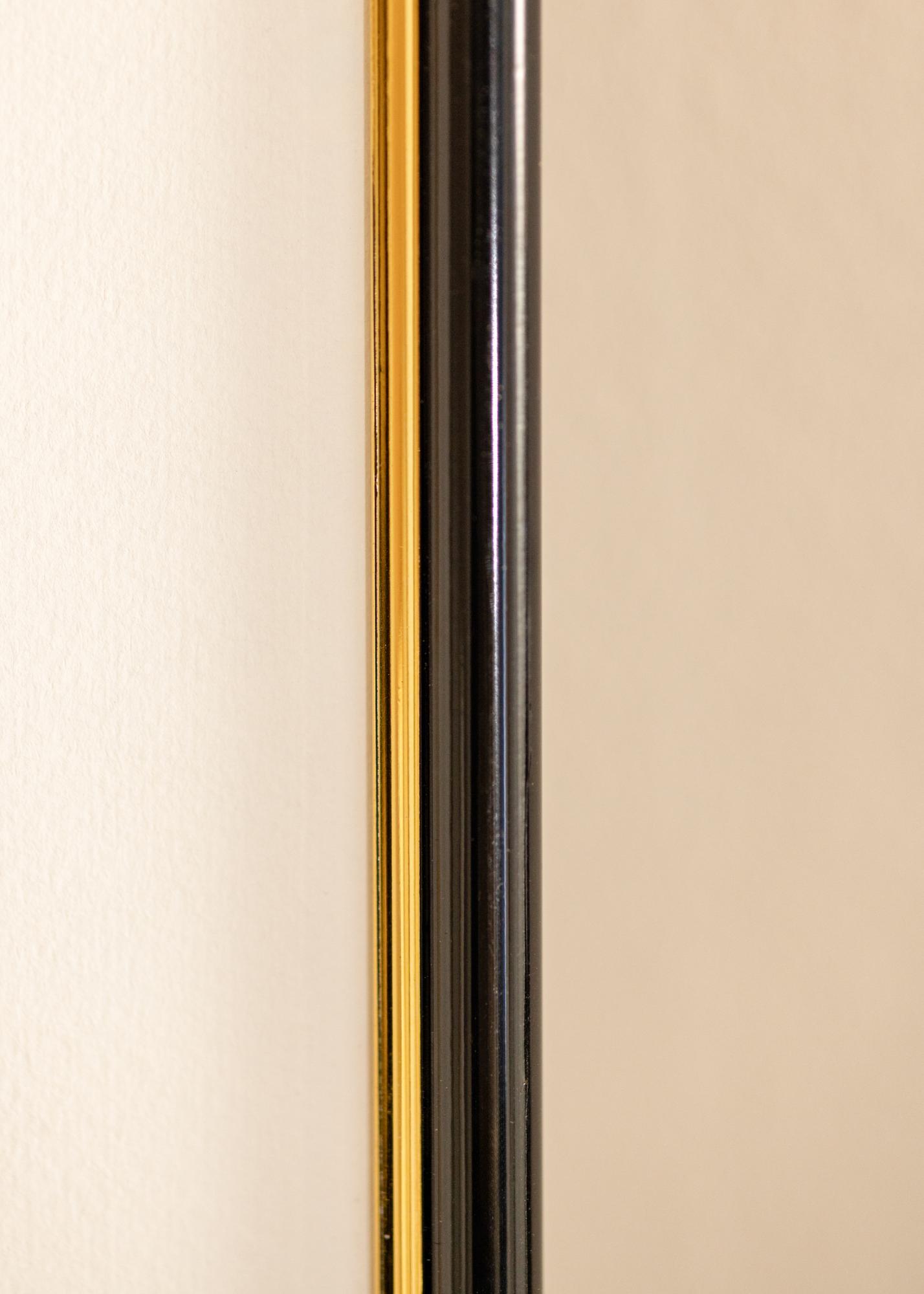 Джаз Черно има класически дизайн със златист вътрешен кант, който придава елегантен вид на рамкираната картина.