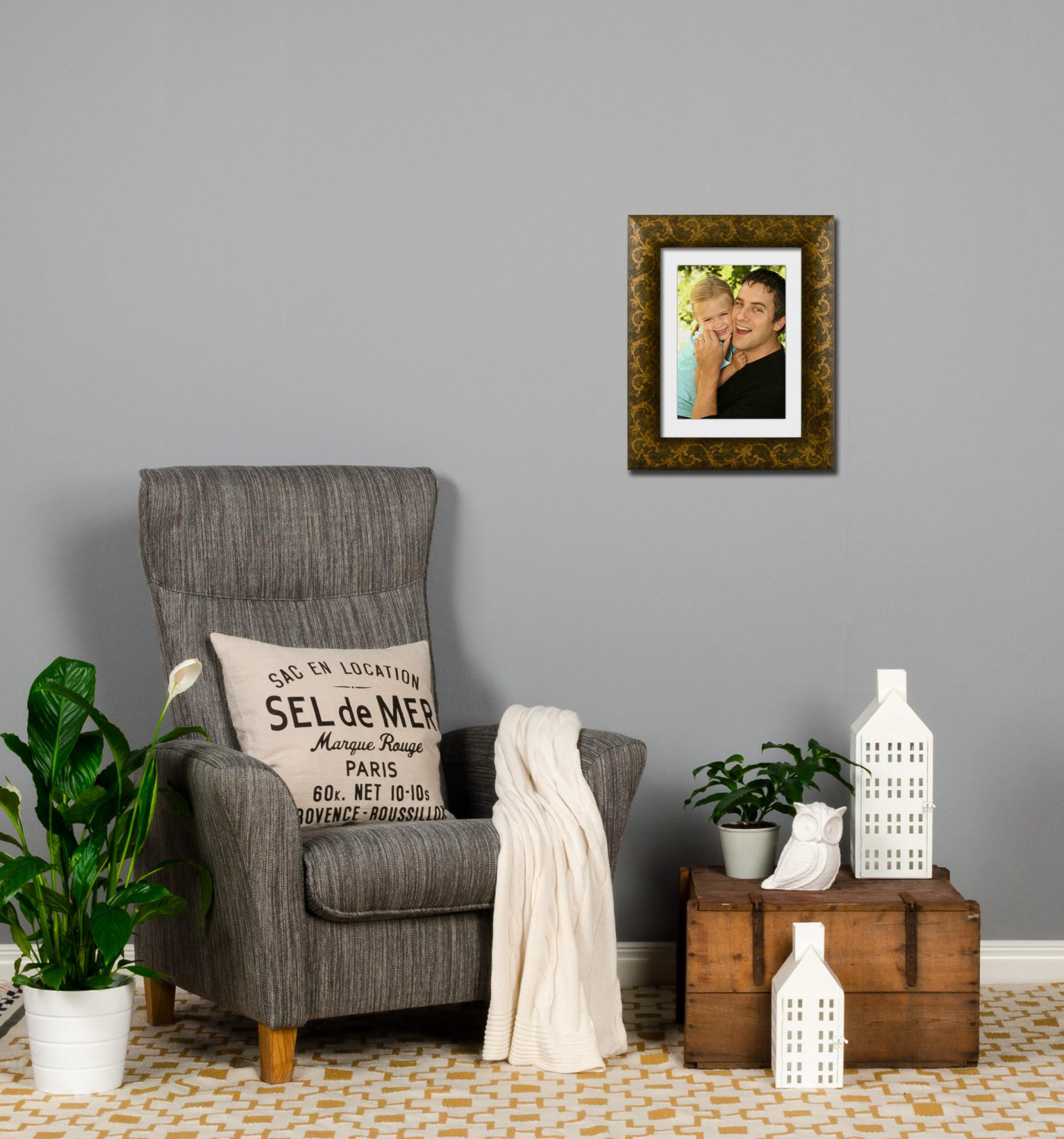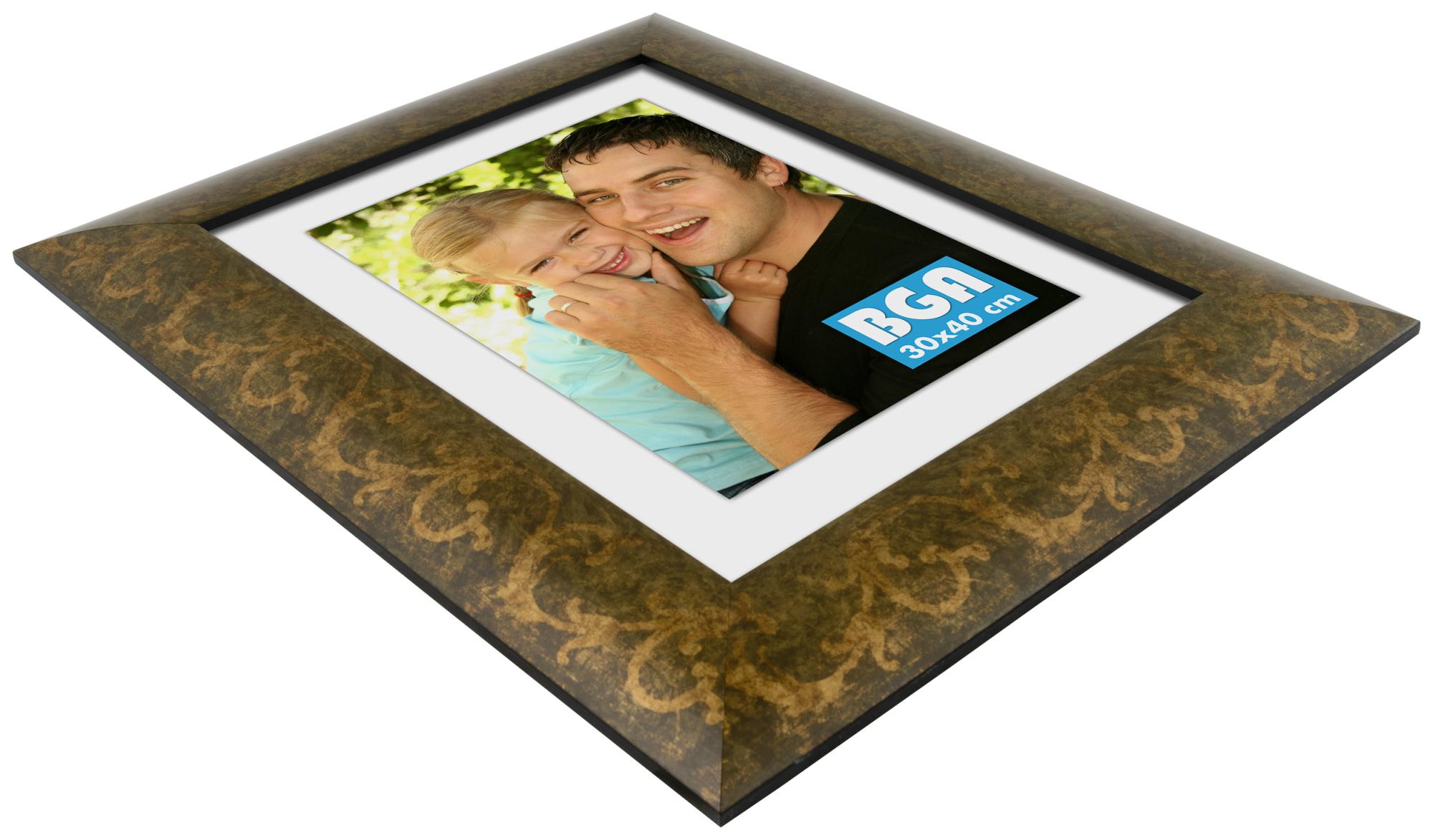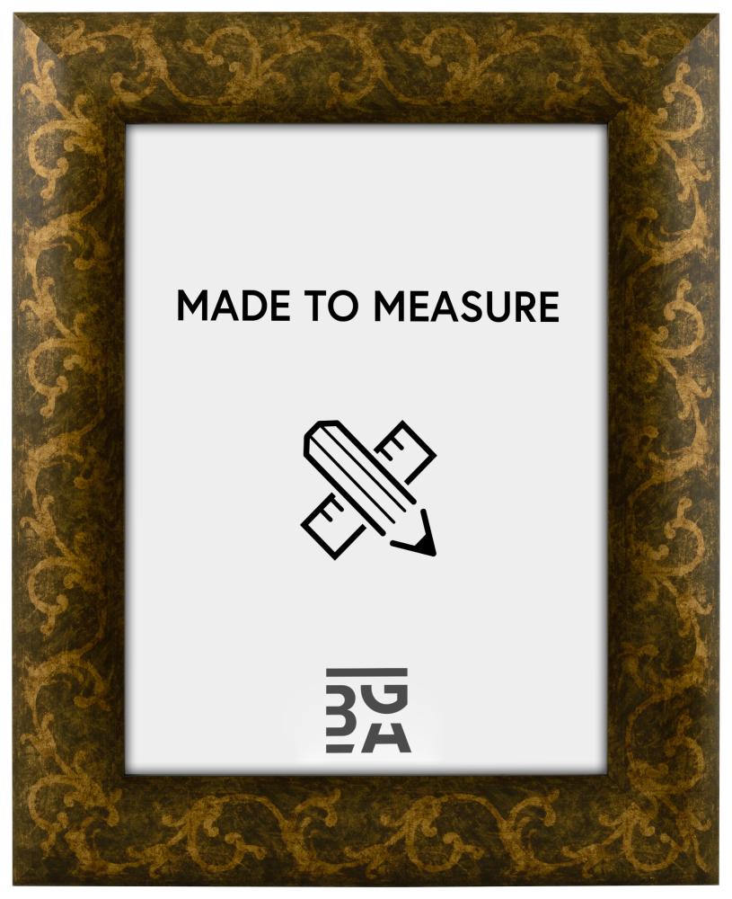 Харесвате ли луксозни интериорни детайли, които добавят характер? Тогава имаме перфектната рамка, в която да поставите най-добрите си снимки! Тази извито оформена рамка има красив десен, който блести в злато. Лъскавата повърхност е обработена за износен и старинен вид, който прекрасно се вписва в класически или старомоден интериор. Тъй като рамката се изработва в нашата собствена работилница за рамки според желаните от вас размери, може да бъдете сигурни, че тя ще пасне точно там, където искате.