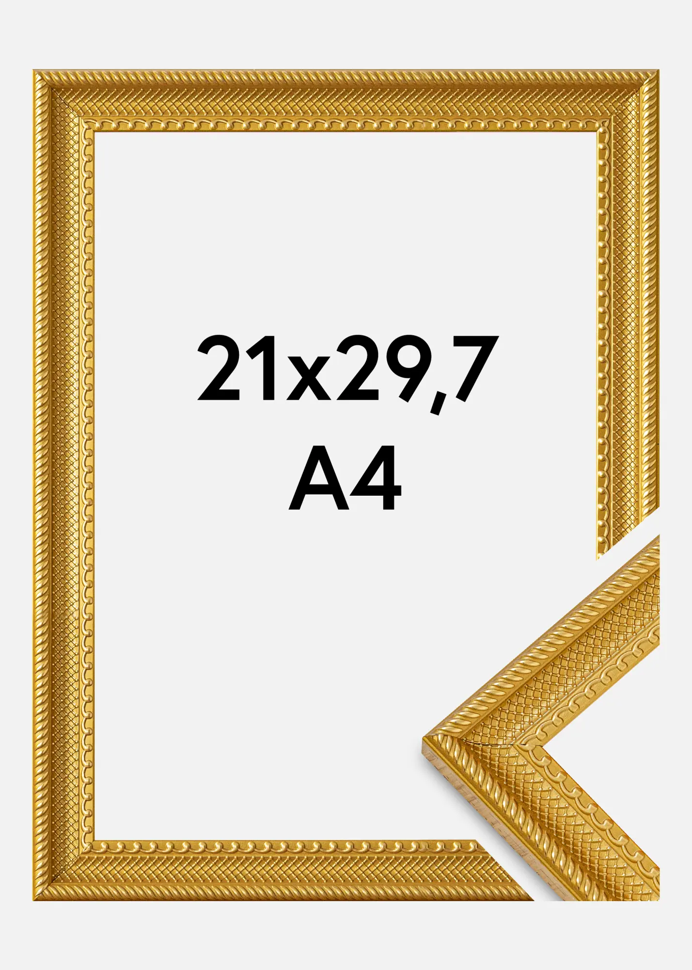 Тази елегантна златна фоторамка е перфектна комбинация от класически дизайн и модерна функционалност. Със своите детайлни мотиви по краищата и блестящо покритие, тя придава луксозно усещане, което подобрява всяко произведение на изкуството или фотография. Рамката е изработена от композитен материал, което ѝ придава здравина и лекота. Тя е предназначена да пасне на мотиви с размер 21x29,7 см (A4), което я прави идеална за стилно представяне на любимите ви спомени.
