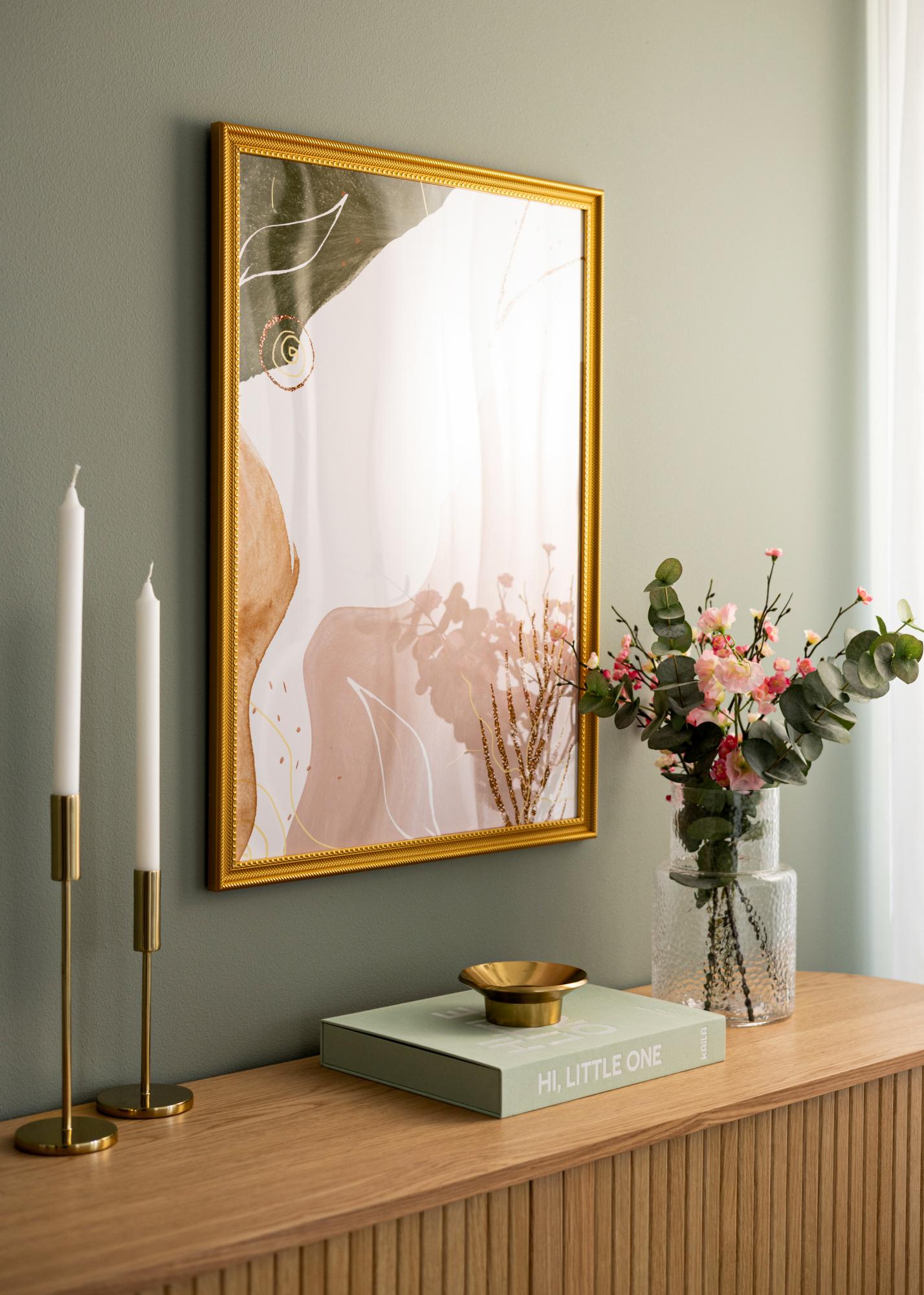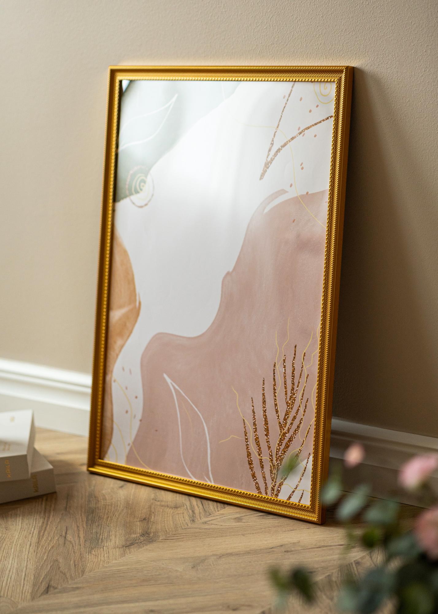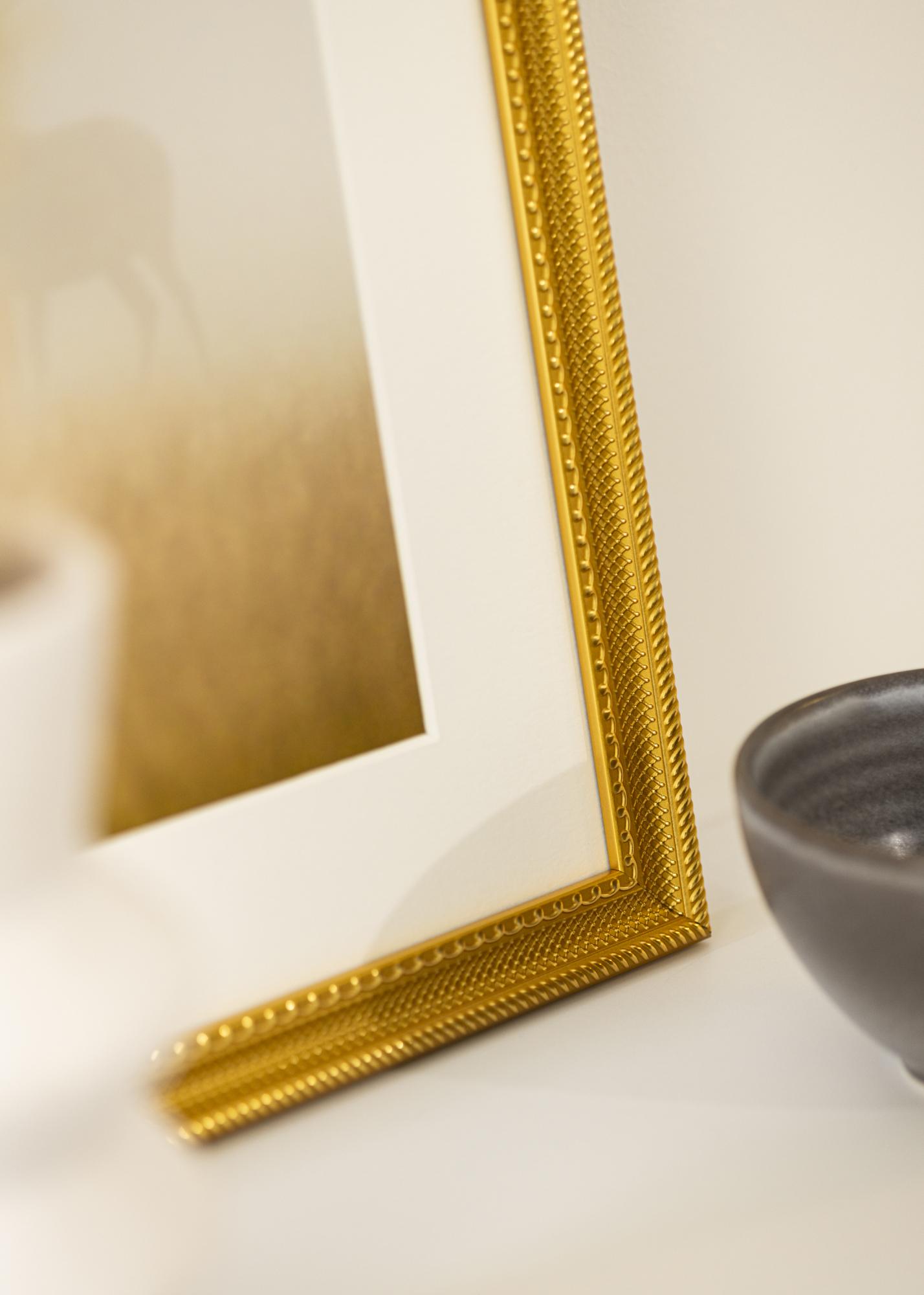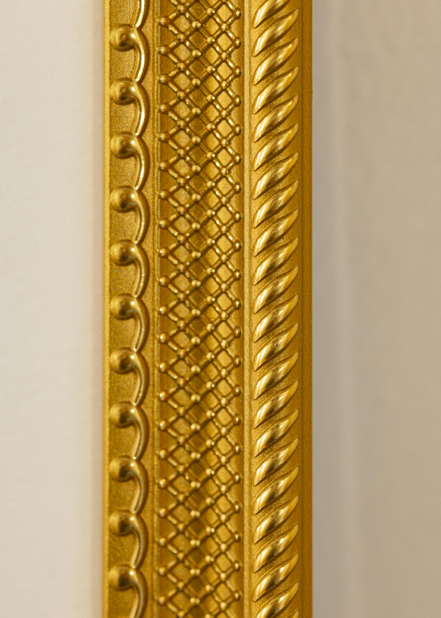 Тази елегантна фоторамка в златен цвят е перфектна комбинация от класически дизайн и модерна функционалност. Със своите детайлни шарки по краищата и блестящо покритие, тя придава луксозно усещане, което подчертава всяко произведение на изкуството или фотография. Рамката е изработена от композитен материал, което й придава както здравина, така и лекота. Тя е проектирана да пасва на мотиви с размери 42x59,4 см (A2), което я прави идеална за по-големи снимки или плакати.