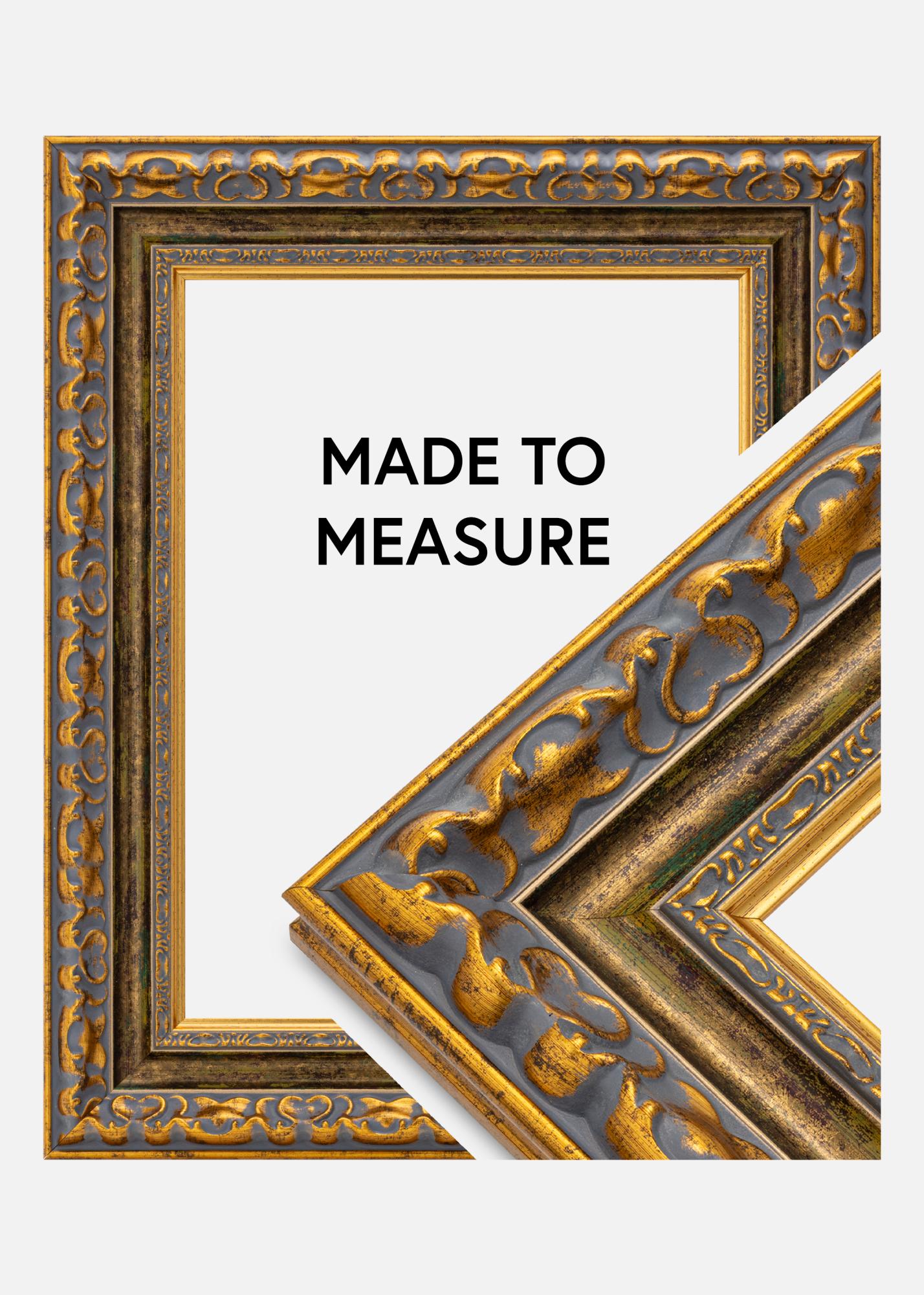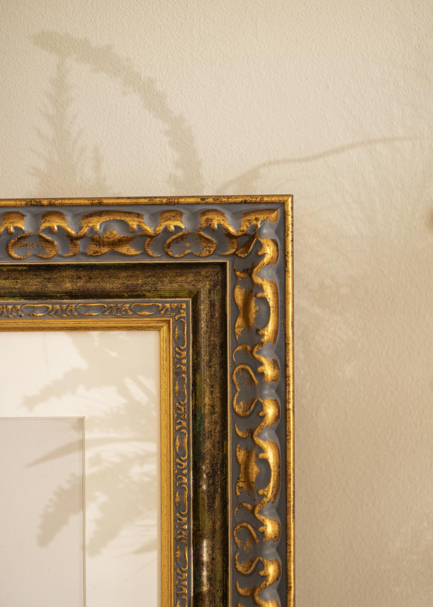 Искате ли да създадете красива картина с уважаемо семейно фото или хубава снимка на семейството? Тогава имаме луксозна рамка, която добавя характер и привлича вниманието! Рамката е великолепно износена с шарки, които преливат в златно и сиво, съответно в златно, зелено и кафяво. Тъй като се произвежда в нашето собствено рамково ателие, можете да бъдете сигурни, че получавате хубава рамка за картина с високо качество.