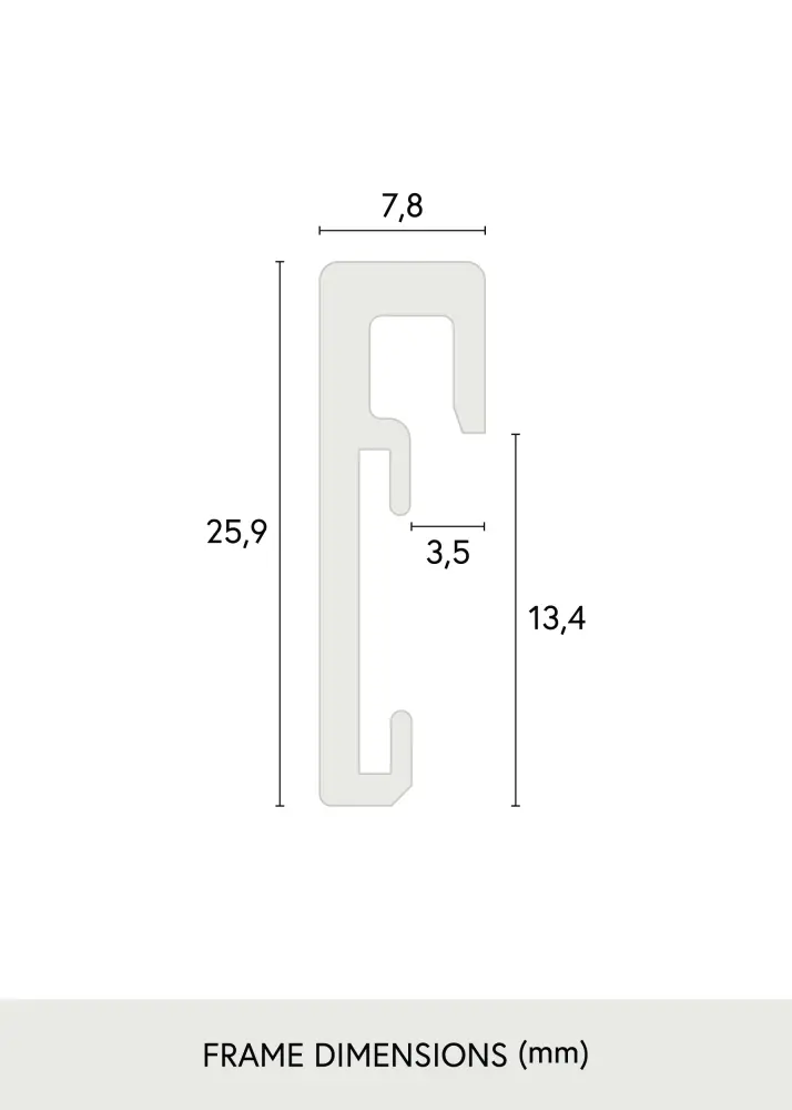 Рамката се изработва от нас в собствената ни рамкова работилница от една от най-фините и най-тънки алуминиеви ленти от Nielsen, заедно с истинско антирефлексно стъкло от Tru Vue, което е също така устойчиво на драскотини и с 70% UV защита. Черната рамка е лъскава и има ширина от само 7,8 мм.